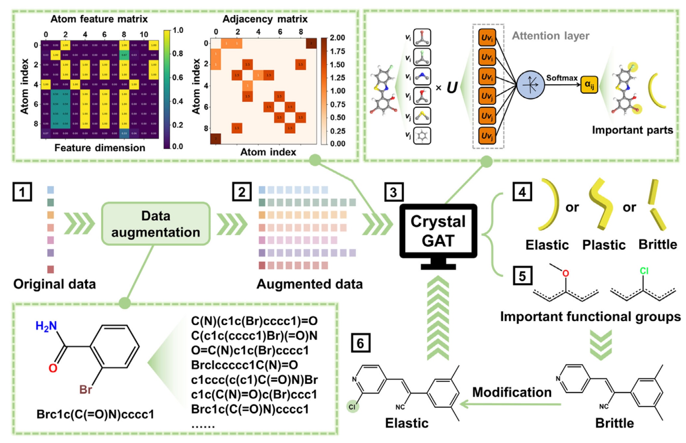 图2|CrystalGAT用于分子力学性能预测及特定性能分子修饰的整体流程示意图。