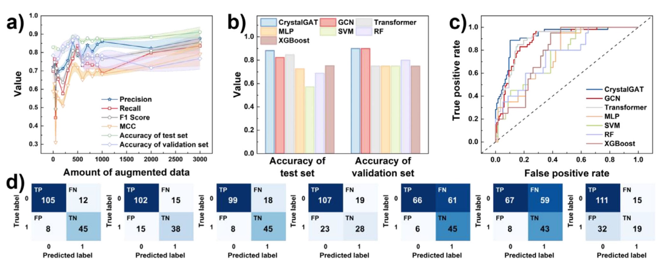 图3| a) 在引入增强数据条件下,CrystalGAT对MolEs预测的准确率、精确率、召回率、F1值和MCC。 b) 不同模型在MolEs任务中测试集与验证集的准确率对比。 c) 不同模型在MolEs任务中的ROC曲线。 d) CrystalGAT、GCN、Transformer、MLP、SVM、RF和XGBoost模型在MolEs测试集上的混淆矩阵。