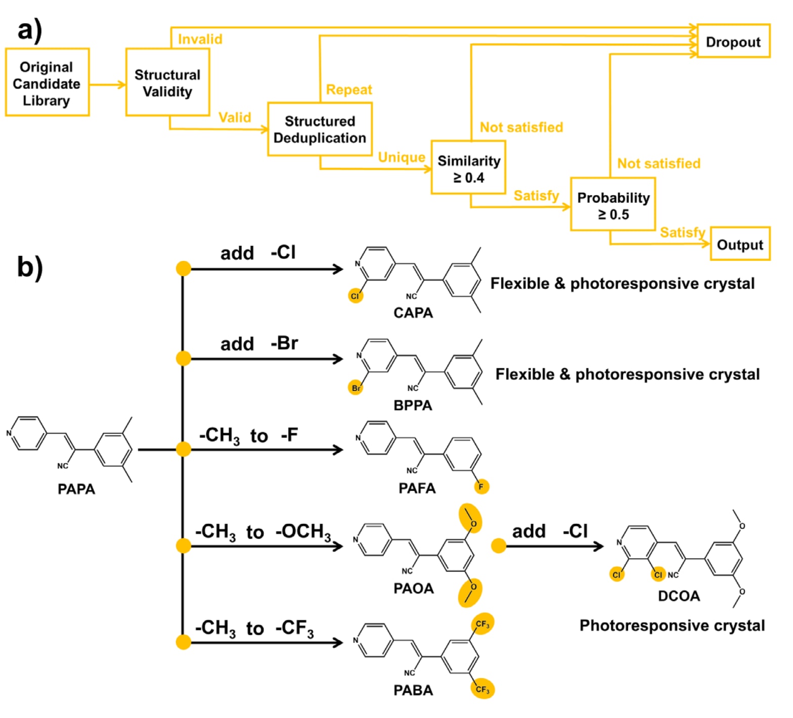 图5|a) 分子修饰流程图。 b) 基于CrystalGAT所提供的重要功能基团进行分子修饰的示意图。