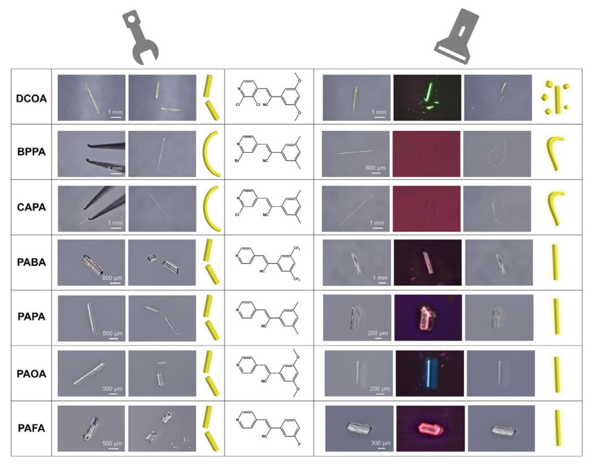 图6|PAPA分子及其修饰分子的结构示意图,左列对应受力诱导的力学行为,右列对应晶体的光响应行为。