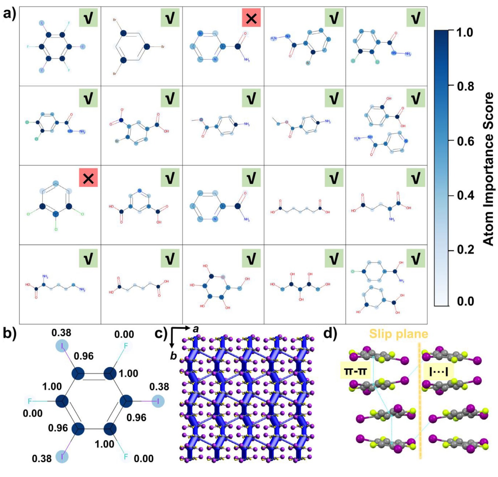 图4|a) MolPs验证集中分子的模型预测结果及原子重要性分析,✓表示预测结果与实际结果一致,×表示预测结果与实际结果不一致。 b) CFI的原子重要性评分。 c) CFI的能量框架。 d) CFI晶体中的分子间相互作用模式。
