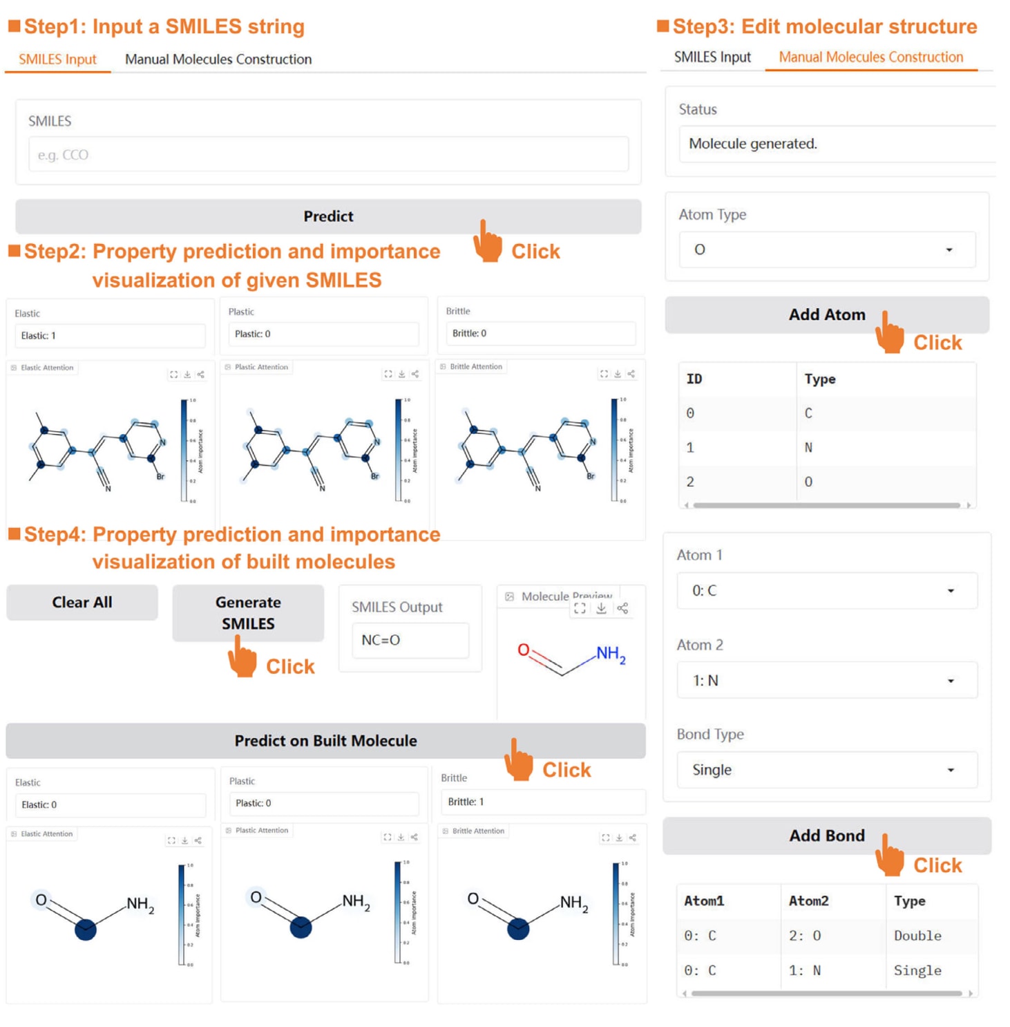 对于尚未明确SMILES表示的分子,“Manual Molecules Construction”模块提供了一种直观的分子结构编辑工具。用户可在“Atom Type”下拉菜单中选择所需原子类型,点击“Add Atom”后,所选原子将按编号顺序列于下方表格中。通过“Add Bond”按钮,可在选定原子之间添加单键、双键或三键连接。在完成所有原子与化学键的构建后,点击“Generate SMILES”即可在画布中显示对应的分子结构,并自动生成相应的SMILES字符串。基于手动构建的分子,同样可以进一步进行力学性能预测以及原子重要性可视化分析。