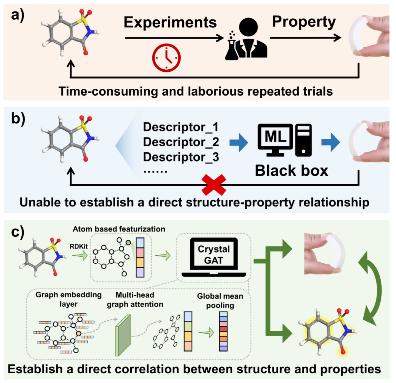赋予功能晶体以柔性能够显著拓展其在柔性智能器件领域中的潜在应用。尽管在理解晶体柔性的基础结构原理方面已经投入了大量研究,但具有机械柔性的晶体发现至今仍多为偶然。近年来,机器学习已成为材料科学中的一种变革性研究范式。基于此,提出了一种创新方法并开发了一个用于预测分子晶体机械性能的平台CrystalGAT。CrystalGAT是一种基于注意力机制的图神经网络模型,通过数据增强策略构建了稳健的最优模型,其预测性能相较于已有模型表现出显著优势。在验证集上,该模型实现了90%的高预测准确率,同时展现出可扩展至多组分体系的良好泛化能力。更为重要的是,利用CrystalGAT识别了影响分子晶体机械性能的关键结构片段,成功实现了将脆性晶体转变为柔性光响应晶体的突破。此外,该平台还能够快速筛选具有塑性的多组分药物晶体,从而提升压片性能。CrystalGAT为柔性分子晶体的设计提供了一种高效方法,展示了其在材料发现与药物分子改性方面的应用潜力。为方便使用者,已建立专用网站:。