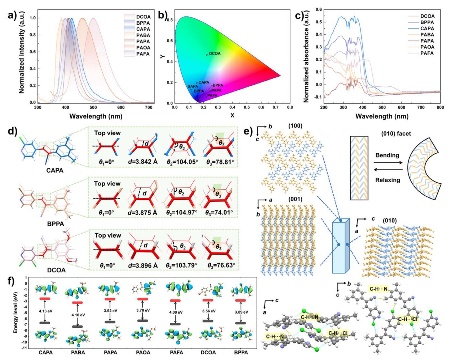 图7|a) 所有晶体在λex=365 nm条件下的荧光发射光谱。 b) CIE色坐标图。 c) 所有晶体的UV-vis吸收光谱。 d) CAPA、BPPA和DCOA晶体中的分子内π-二聚体结构。 e) 沿不同晶体取向观察的CAPA晶体分子间相互作用模式。 f) 所有晶体的HOMO和LUMO分子轨道示意图及其等密度表面分布。