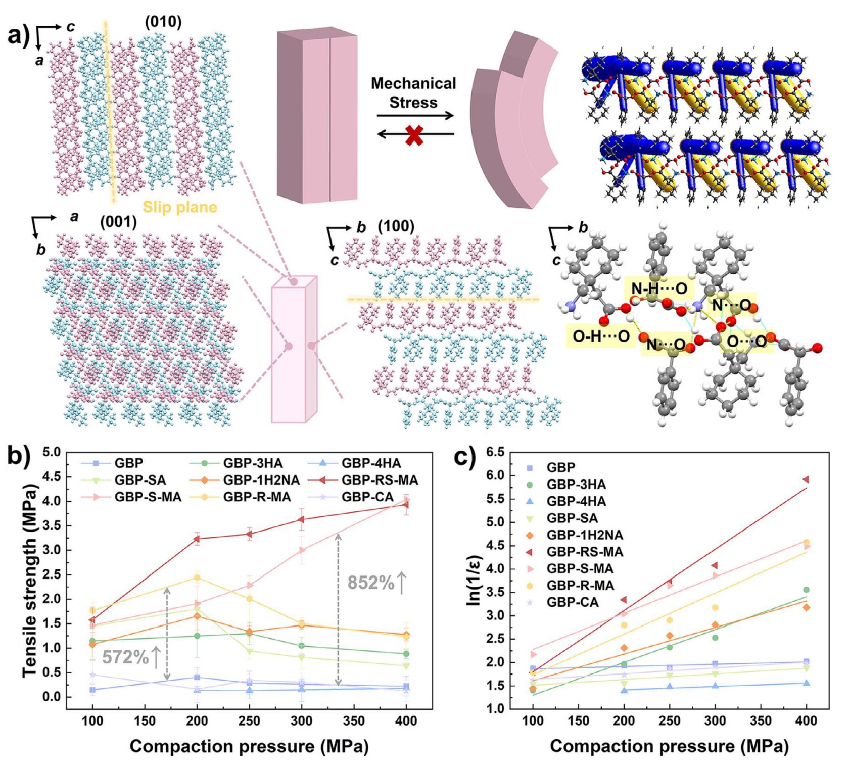 图9|a) 沿不同晶体取向观察的GBP-RS-MA晶体分子间相互作用模式。 b) GBP及其多组分晶体的可压片性能曲线。 c) GBP及其多组分晶体的Heckel分析结果。