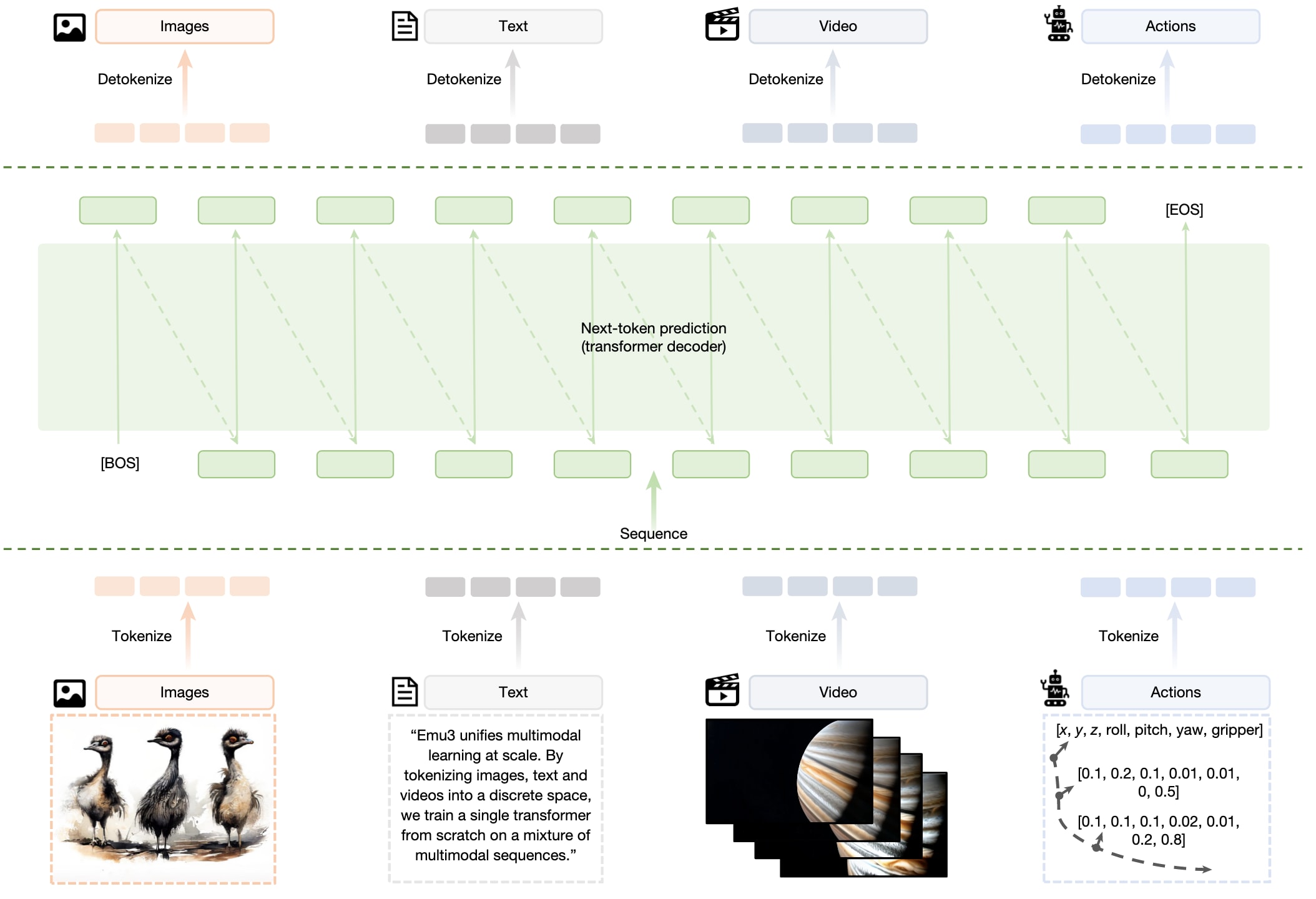 图1 | Emu3 框架。 Emu3首先将图像、文本、视频和动作等多模态数据词元化为离散词元,随后按照顺序将这些词元串联起来,并通过Transformer解码器在大规模条件下执行统一的下一词预测。该框架还被自然地推广到机器人操作场景,将视觉、语言和动作统一视为单一的词元序列进行建模。