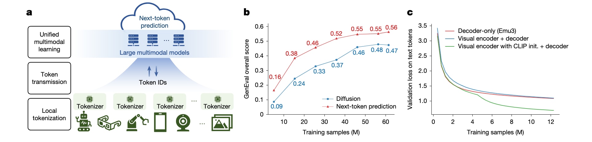 图3 | 以词元为中心的多模态基础设施,以及与扩散模型和编码器加语言模型组合式范式的架构对比。 a,多模态数据的词元化可以直接在边缘设备上完成,仅将生成的离散词元ID传输至大规模服务器,用于统一的多模态训练与推理。b,在图像生成任务中,比较潜变量扩散范式与下一词预测范式时,GenEval总体得分随训练样本数量变化的关系。c,在图像理解任务中,当语言模型从零开始训练时,文本词元的验证损失随训练样本数量变化的情况,对比仅解码器范式与编码器加语言模型的组合式范式,并进一步区分是否采用CLIP初始化。Init.表示初始化。