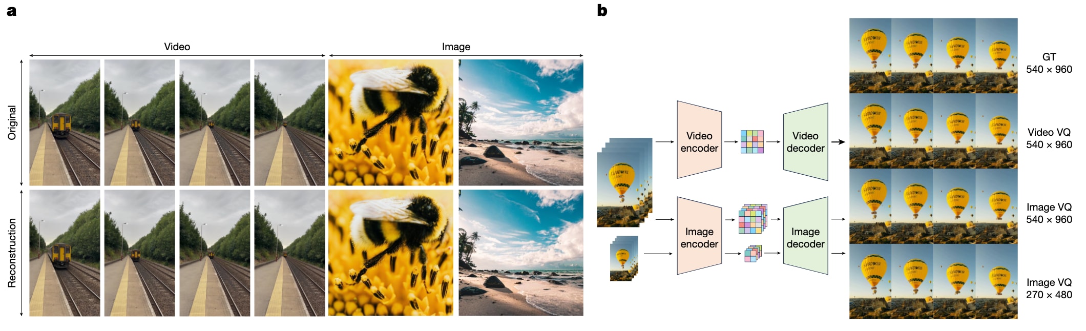 图5 | 词元器的重建样例以及统一视频词元器与独立图像词元器的对比。a,原始视频和图像与其重建结果。视频分辨率为540×960,以30 fps采样8帧,图像分辨率为512×512。b,在相同分辨率下,视频词元器使用少四倍的潜在词元数量即可实现相当的重建质量。当将图像词元器下采样至相同的总词元数量时,其重建质量明显下降。细节请放大查看。图像来源于Pexels。
