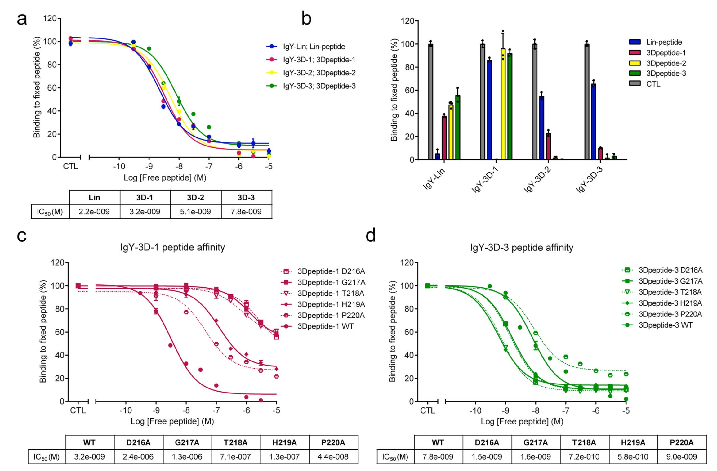 研究还进一步评估了肽序列本身在抗体识别中的重要性。通过将预测为主要暴露于表面的氨基酸残基(D-G-T-H-P)逐一替换为丙氨酸(A),即进行丙氨酸扫描分析,系统考察各残基对抗体结合的贡献。该分析聚焦于最能模拟ECL2三维结构的两种宏环肽,即3Dpeptide-1和3Dpeptide-3。与野生型3Dpeptide-1的结合情况相比(IC50为3.2 ± 0.6 nM),IgY-3D-1对所有突变肽的亲和力均显著降低,其中D261A、G217A和T218A突变影响尤为明显,对应的IC50值分别升高至2447 ± 852 nM、1286 ± 354 nM和708 ± 194 nM。相较之下,IgY-3D-3对3Dpeptide-3中这些突变的敏感性较低,抗体结合能力未出现显著下降。与野生型3Dpeptide-3的IC50值7.8 ± 2.2 nM相比,T218A和H219A突变甚至略微增强了IgY-3D-3与肽段的结合能力,其IC50值分别为0.72 ± 0.04 nM和0.58 ± 0.07 nM。