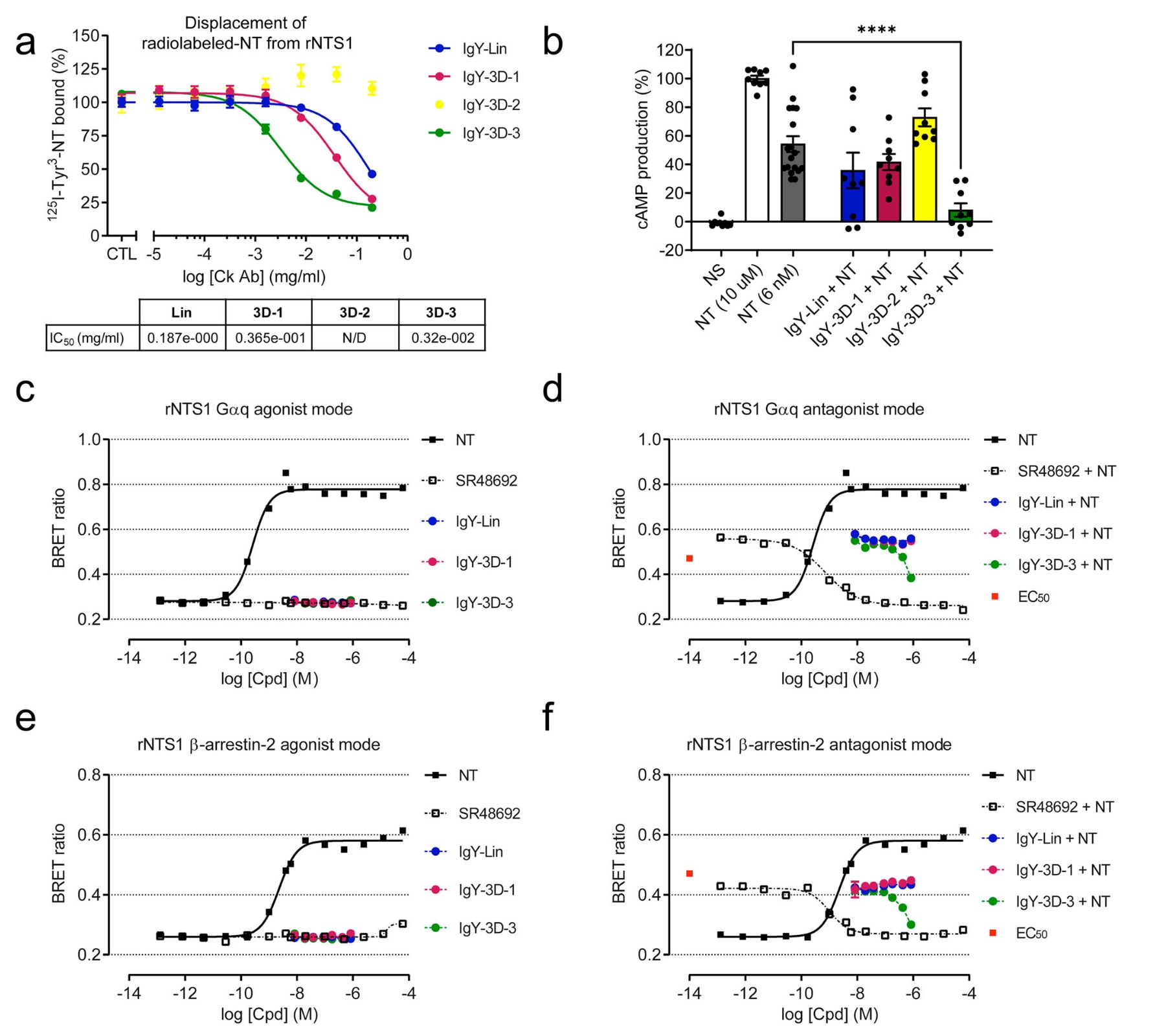 在不同细胞类型中,NTS1受到NT刺激后可激活Gαs、Gαq、Gαi/o和Gα13信号通路,并招募β-arrestin 1和2。为判断这些抗NTS1抗体是否能够调节NTS1依赖的信号活性,研究首先采用基于细胞的均相时间分辨荧光(HTRF)方法,检测Gαs介导的环磷酸腺苷(cAMP)累积。具体而言,在稳定表达rNTS1的CHO-K1细胞中,以NT的EC50浓度进行刺激,并同时加入IgY-Lin、IgY-3D-1、IgY-3D-2或IgY-3D-3(图5b)。结果表明,仅IgY-3D-3能够显著抑制NTS1介导的cAMP生成。