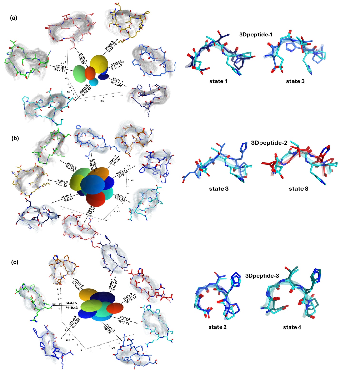 图1 | 3D肽的预测亚稳态构象及其与ECL2主链的叠合结果。 行(a–c)分别对应3Dpeptide-1、3Dpeptide-2和3Dpeptide-3。每一行的中央面板展示了分子动力学数据在三维tICA空间中的嵌入结果,由高斯隐马尔可夫模型识别的亚稳态构象以彩色椭球表示,并标注其所占比例。围绕该嵌入图的是每个状态中随机选取的50个构象的带状结构表示,并叠加于整个构象集合的半透明密度分布之上。每一行最右侧的面板显示了与激动剂结合状态下rNTS1受体胞外环2(ECL2)主链进行叠合的两种最低RMSD质心结构,以棒状形式表示,其颜色与对应椭球的颜色一致,rNTS1的ECL2主链以青色带状结构表示。