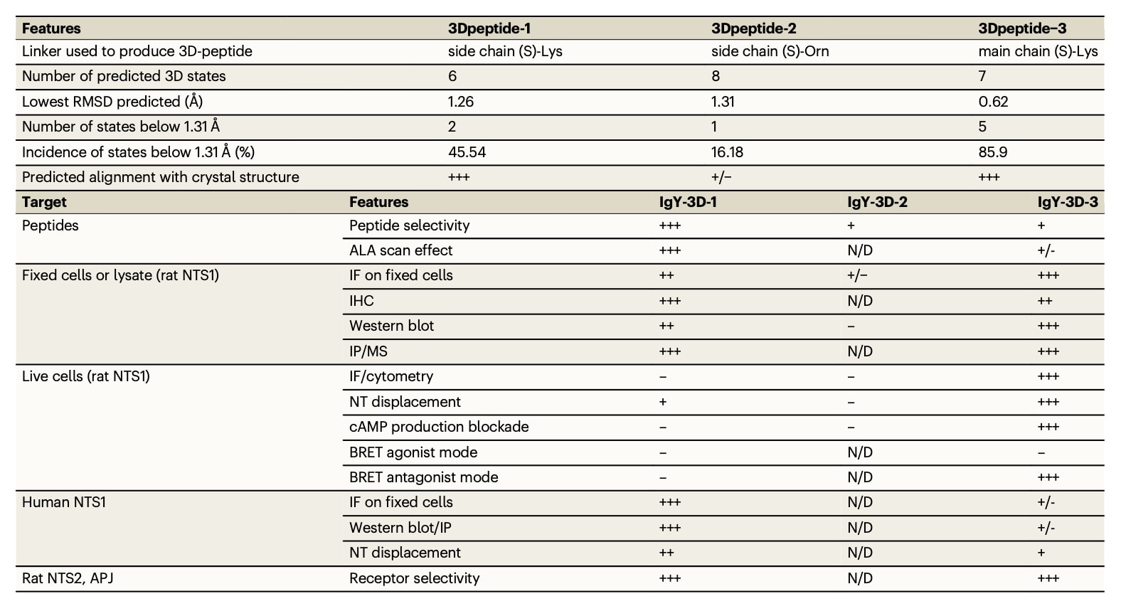 表2 | 三种3D肽及其对应IgY抗体主要特征的总结