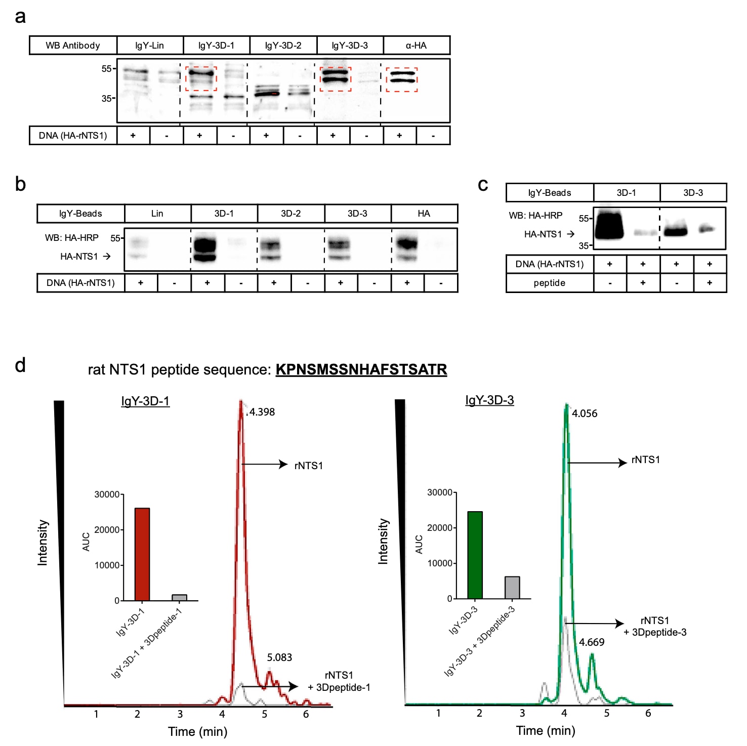 图4 | 通过WB、IP和MS对抗体进行验证。 a Western blot结果显示,在稳定表达HA-rNTS1或转染空载体作为对照的HEK293A细胞裂解液中,分别使用鸡源抗NTS1抗体(IgY-Lin、IgY-3D-1、IgY-3D-2和IgY-3D-3)及抗HA抗体检测大鼠NTS1受体。红色虚线框标示出对应rNTS1的信号条带。b 采用与磁珠偶联的各类鸡源抗体,对稳定表达HA-rNTS1的细胞进行NTS1的免疫共沉淀,并使用抗HA抗体进行免疫印迹检测。转染空载体的HEK293A细胞作为阴性对照。c 用于后续质谱鉴定的rNTS1免疫共沉淀样品的免疫印迹结果。阴性对照为在1:10比例下将IgY与其对应肽预孵育后进行的处理。d 采用IgY-3D-1(红色谱图)和IgY-3D-3(绿色谱图)进行质谱分析,得到的大鼠来源NTS1受体肽段的提取离子流色谱图(XIC)。与IgY对应肽预孵育的阴性对照以灰色曲线表示。(内嵌图)显示使用Peakview 2.2软件计算得到的各条件下曲线下面积(AUC)。所有数据均代表至少两次独立实验的结果。质谱分析在两个不同的研究机构中完成。原始数据已作为Source Data文件提供。