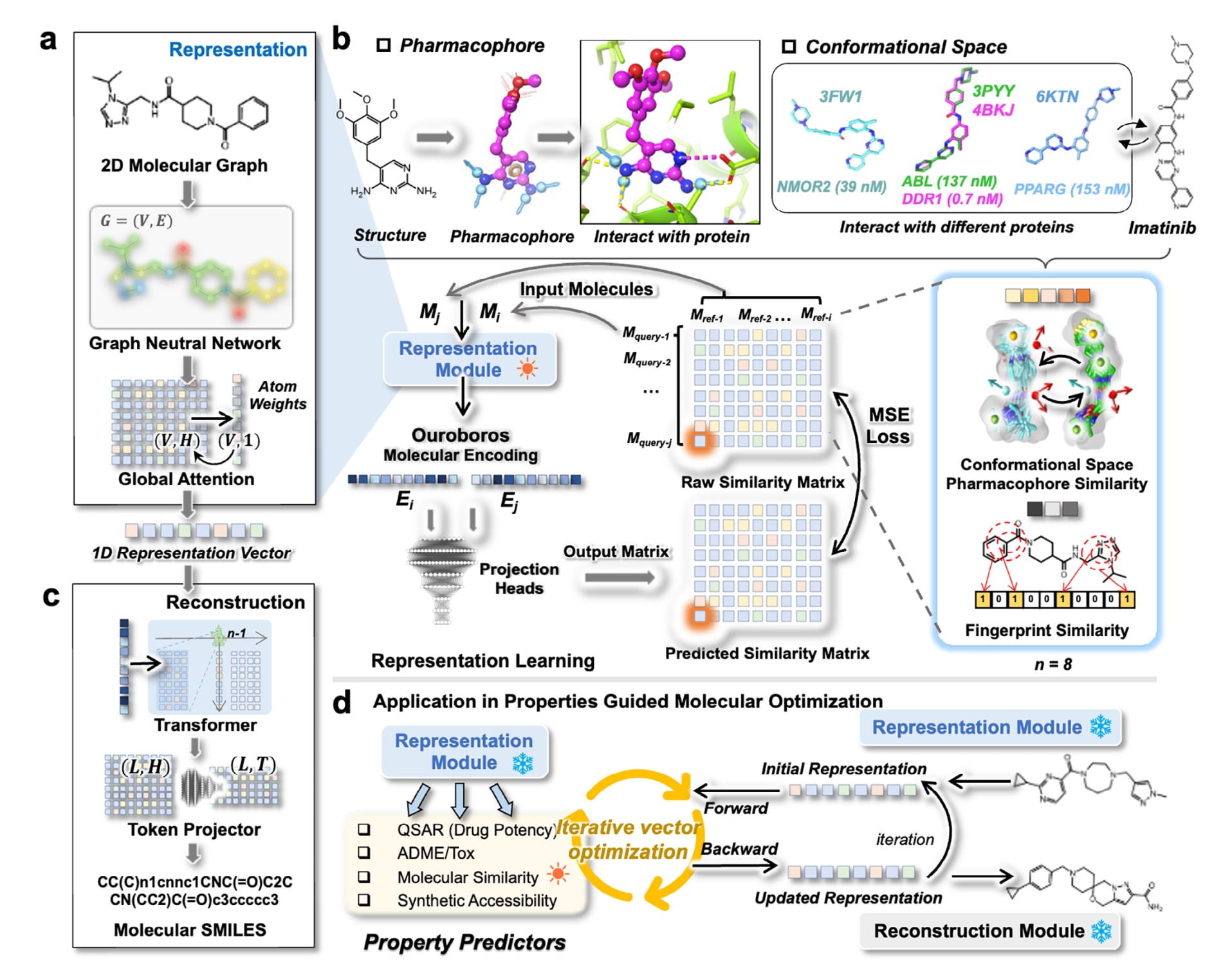 图1 | 展示了Ouroboros分子基础模型的动机与整体架构。 (a)表征模块通过图神经网络与原子级注意力机制将分子图转换为1D表示向量。(b)Ouroboros表征学习的动机在于,小分子的药效团与构象空间体现其执行药理功能的方式:在药效团视角中,氢键供体标记为天蓝色箭头,氢键受体标记为红色箭头,芳香环标记为橙色圆形或球体,疏水基团标记为绿色球体;在配体-口袋结合构象中,氢键以黄色虚线表示,盐桥以品红色虚线表示;伊马替尼的实验配体结构对应的PDB编号标注在分子构象旁;其中