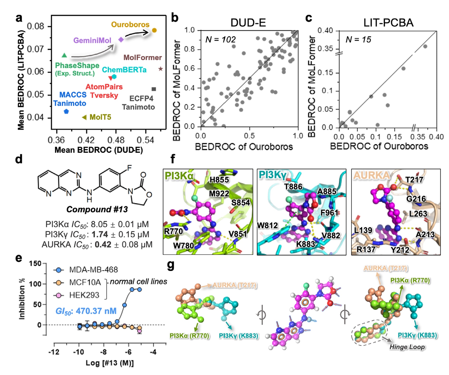图2 | 展示了使用Ouroboros表示相似性进行虚拟筛选与定向多靶点设计的结果。 (a)在DUD-E的102个靶点与LIT-PCBA的15个靶点上,使用平均BEDROC比较多种方法的相似性虚拟筛选性能,包括Ouroboros、GeminiMol、PhaseShape(构象依赖)、ChemBERTa(ChemMLM表现最佳版本)、AtomPairs、ECFP4与MACCS。(b)在DUD-E的102个靶点上,Ouroboros与MolFormer逐靶点对比。(c)在LIT-PCBA的15个靶点上,Ouroboros与MolFormer逐靶点对比。(d)命中化合物#13对PI3Kα、PI3Kγ与AURKA的