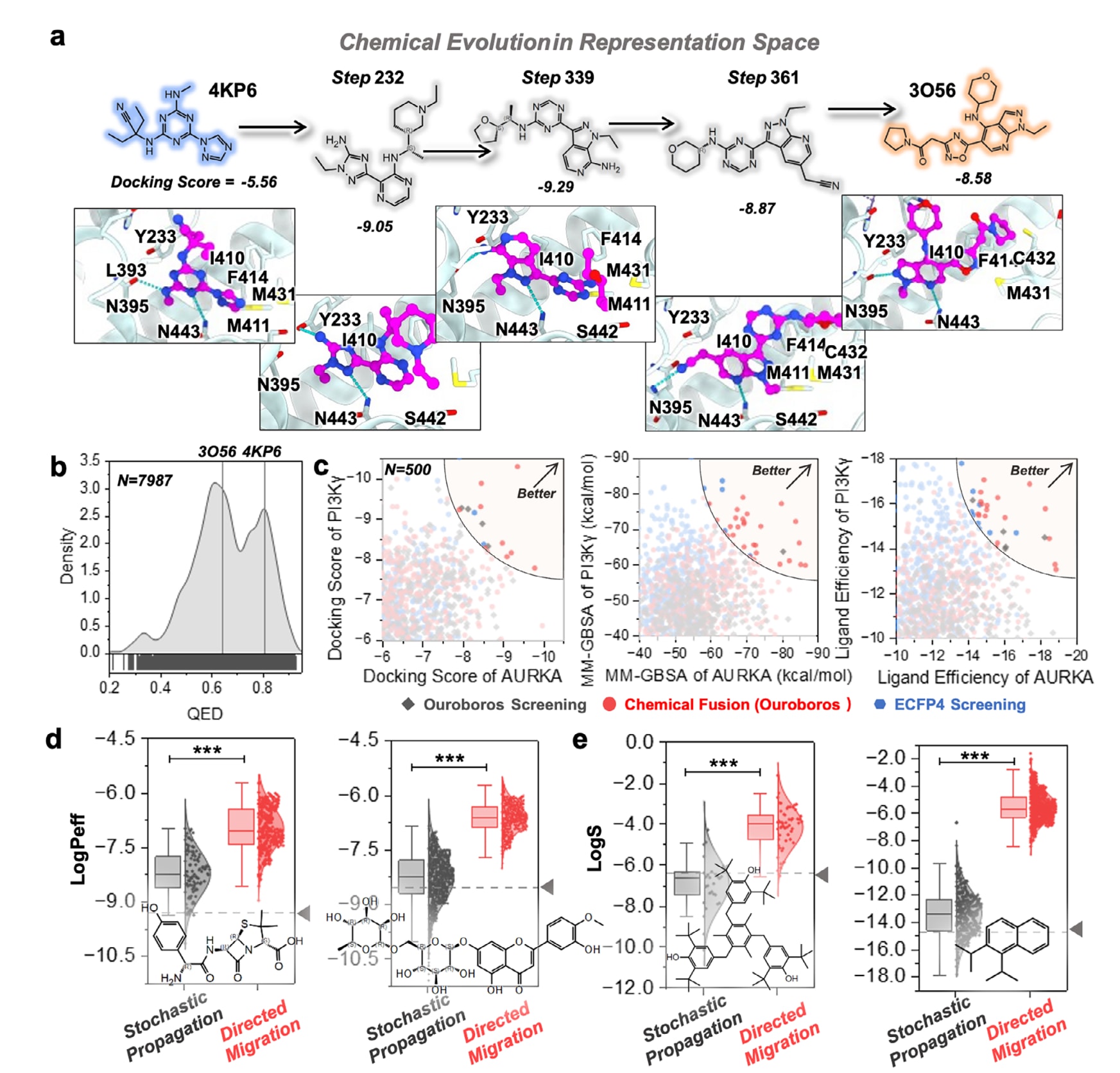 得益于Ouroboros的正交架构,各类性质预测器都可以直接用于定向分子优化。该部分使用第三方评估工具QikProp对比随机传播与定向化学演化在性质优化上的表现。图4d,e展示了更大规模上的水溶性与膜通透性优化结果,选取了四个具有代表性的有机分子:两种膜通透性较低的分子(阿莫西林与地奥司明),以及两种疏水且水溶性较差的分子(起始结构见图中标注)。损失函数被设计为在保持与原始分子结构相似性的同时,共同提升溶解度、膜通透性与脂溶性(具体见Methods)。尽管对两类性质欠佳的分子使用相同损失函数,定向迁移仍能生成多种在膜通透性或溶解度上显著改善的新分子,并将表示相似度维持在0.6以上。这些结果体现了Ouroboros定向迁移在多目标分子性质优化中的通用性与有效性。