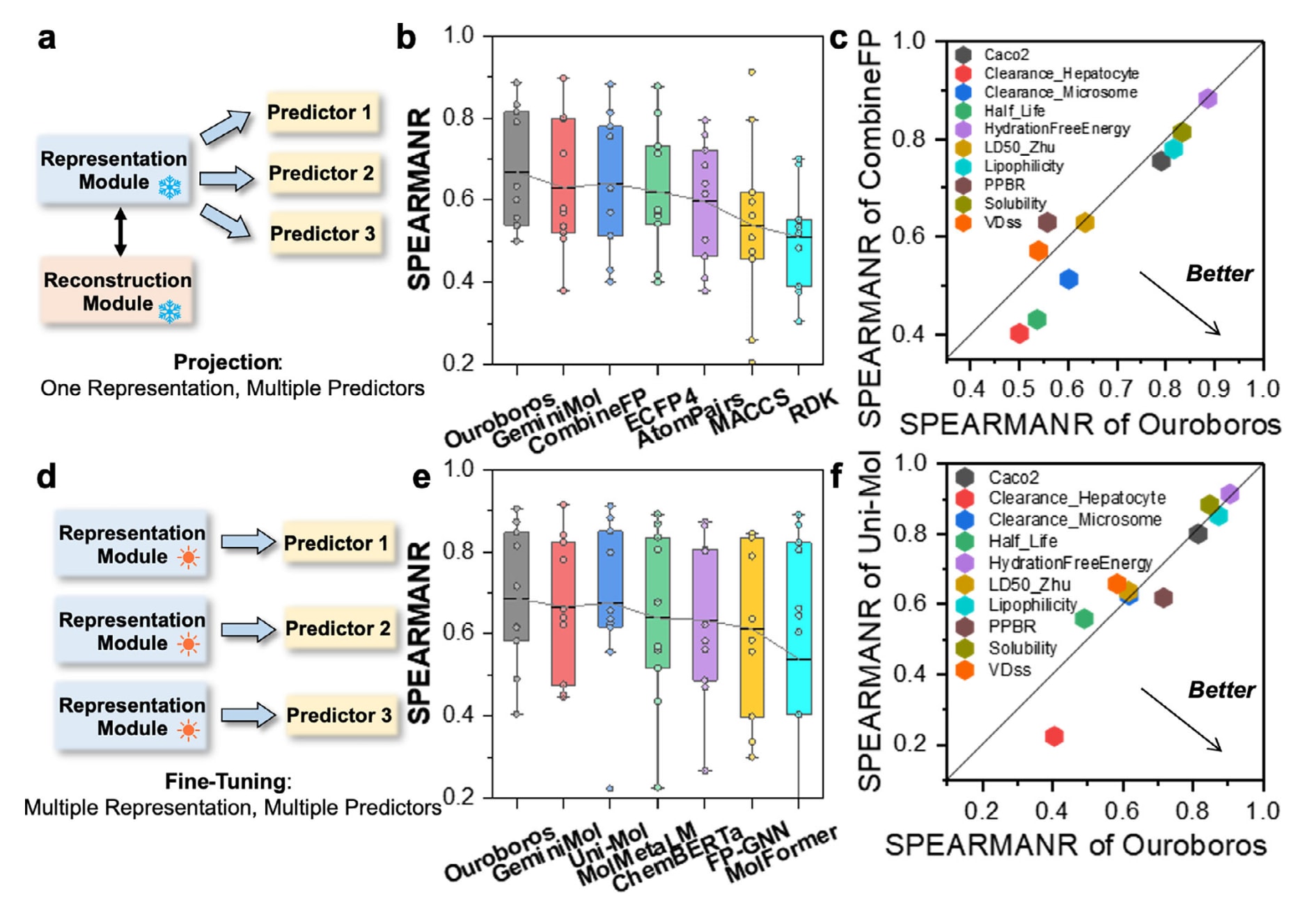 图3 | 展示了基于Ouroboros表征模块训练性质预测器的流程与结果。 (a)性质预测器的投影策略。(b)7种分子表示方法在10个回归性质任务上的Spearman相关系数对比,其中GeminiMol与Ouroboros的性质预测器均使用多层感知机MLP构建;CombineFP将AtomPairs、TopologicalTorsion、ECFP4与FCFP6四类指纹组合,并使用神经网络构建性质预测器。(c)Ouroboros在10个性质回归任务上的Spearman相关系数(以不同任务区分)与CombineFP的对比。(d)性质预测器的微调策略。(e)微调模式下,Ouroboros与GeminiMol、几何预训练基线Uni-Mol、三种化学语言基线MolMetaLM、ChemBERTa与MolFormer,以及QSAR基线FP-GNN的SpearmanR对比。(f)Ouroboros与Uni-Mol的逐项对比。