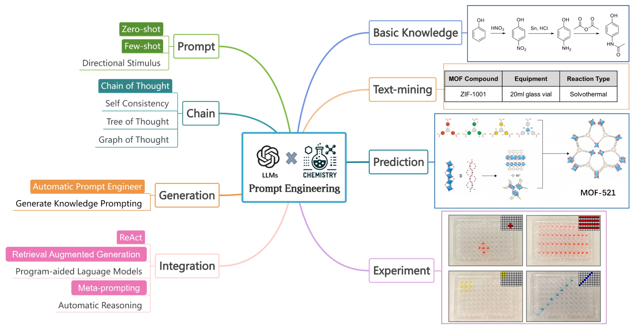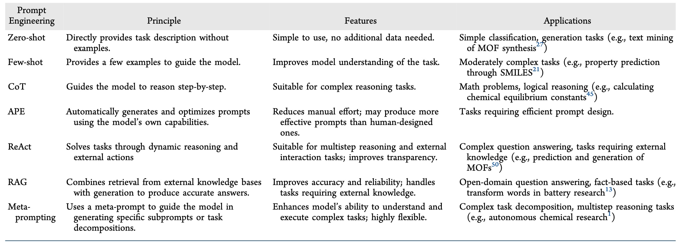 图1|大型语言模型在化学研究中的提示工程方法示意图。
