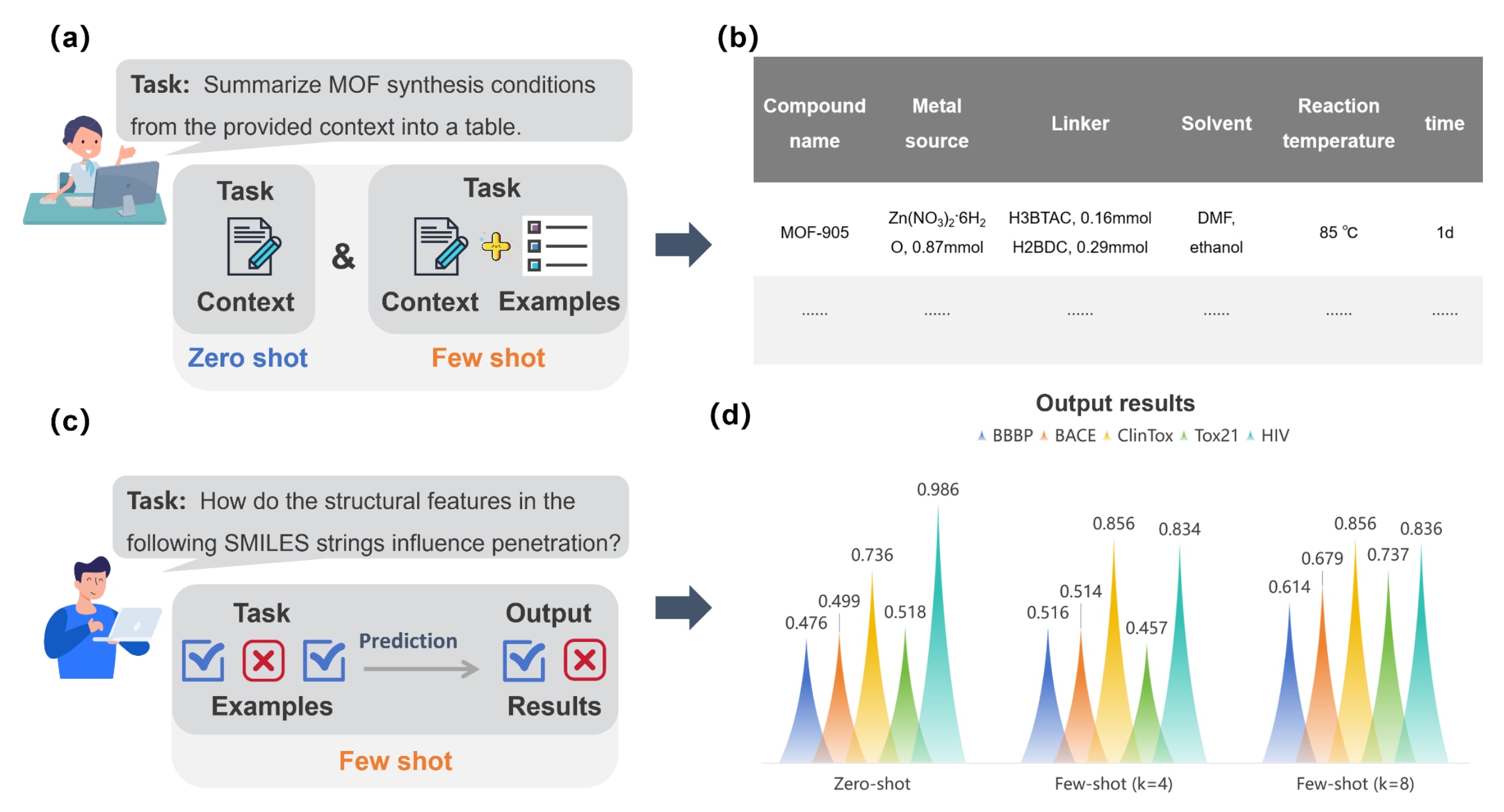 近期,有研究将零样本与少样本提示应用于金属有机框架材料合成文本的挖掘。通过明确指定输入文本和期望的输出格式,成功将MOF实验部分转化为结构化表格,准确提取了化合物名称、金属源、有机配体、反应温度以及反应时间等关键合成参数。同时发现,在少样本提示策略中提供四到五个简短示例,相比零样本方式更有助于模型识别合成段落的特征。