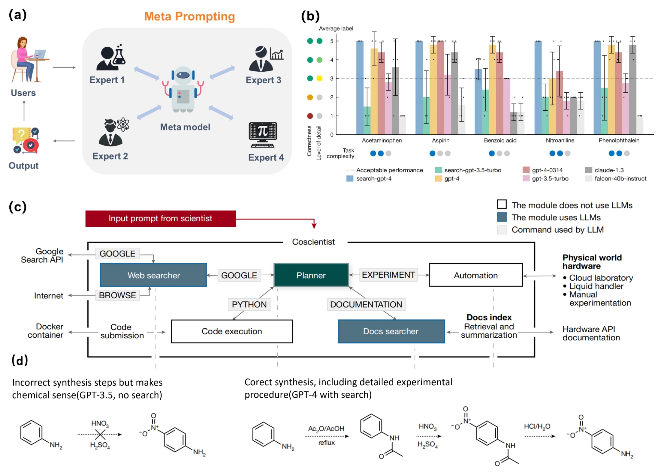 图5|元提示的示意及应用。 (a)元提示的结构示意图。(b)Coscientist在化学合成规划任务中的能力展示,包括不同大型语言模型在化合物合成方面的对比。(c)Coscientist的工作流程示意图。(d)两个生成的硝基苯胺合成示例。