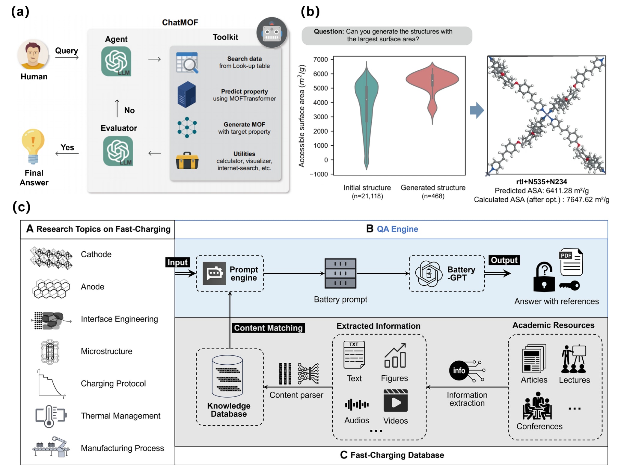 图4|ReAct与RAG的示意及应用。 (a)基于推理与行动协同提示原理构建的ChatMOF框架示意图。(b)初始结构与生成结构的最大比表面积分布,以及通过ChatMOF并结合优化数据生成的具有最大比表面积的MOF结构。(c)检索增强生成方法在快充电池研究中结合大型语言模型的应用示意图。