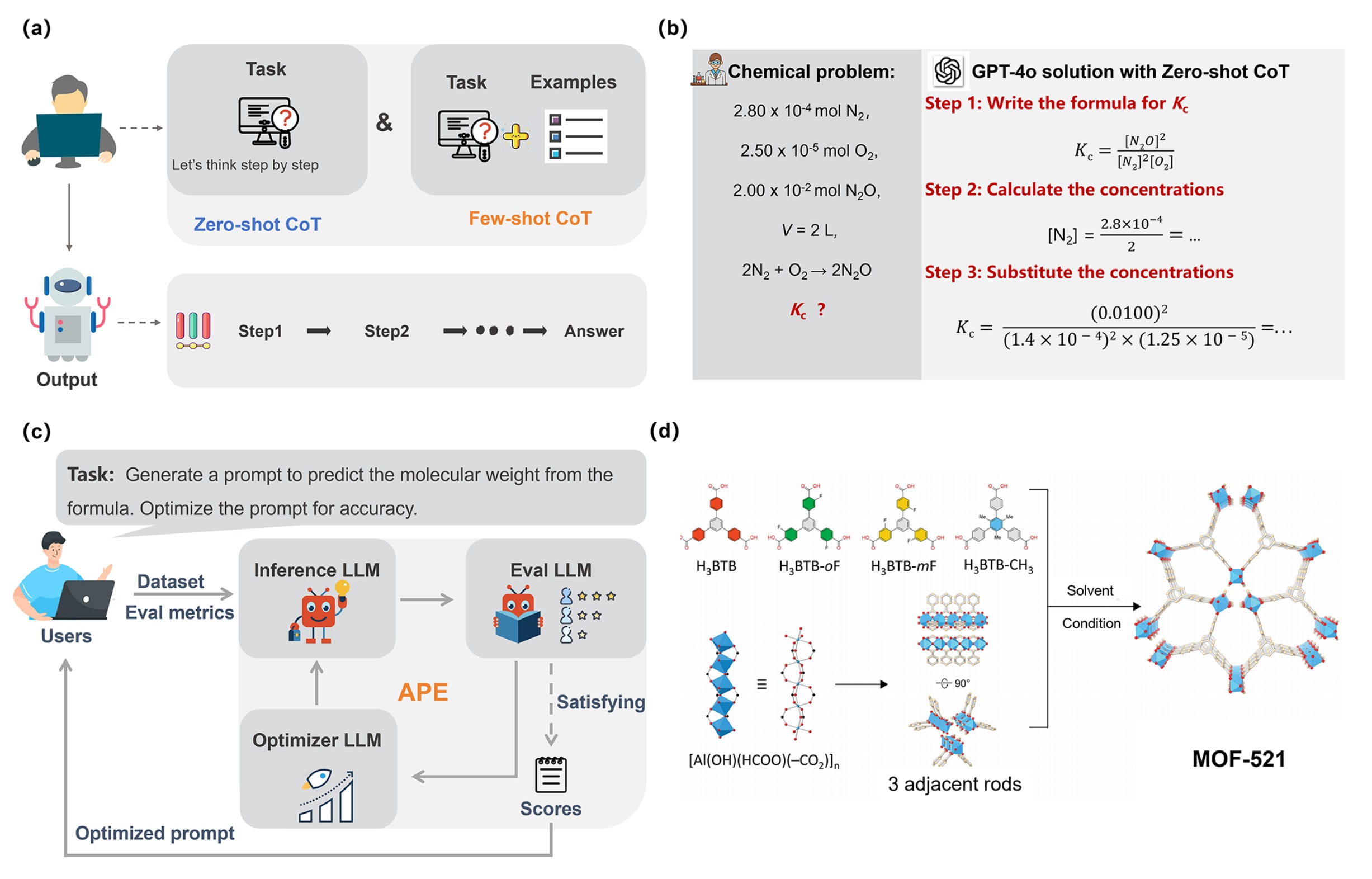 链式思维提示在化学问题中的有效性已有多项验证。例如,在采用零样本链式思维提示进行平衡常数