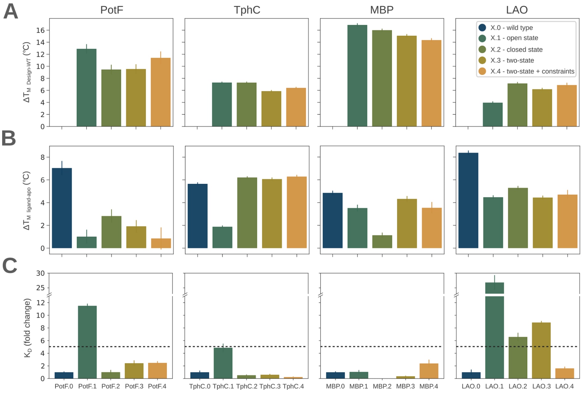 图3|周质结合蛋白野生型及其设计变体的热稳定性和结合亲和力。 (A) 表观熔解温度变化ΔTm相对于野生型计算。(B) 在加入100 μM配体后表观ΔTm的变化,通过减去相应无配体对照样品得到。(C) 相对于野生型的结合常数KD变化倍数。误差线表示三次独立重复实验的标准偏差。在PotF、TphC、MBP和LAO的结合实验中,分别使用腐胺、对苯二甲酸、麦芽糖和L-赖氨酸作为配体。相对于野生型结合亲和力降低5倍的位置以虚线标示。