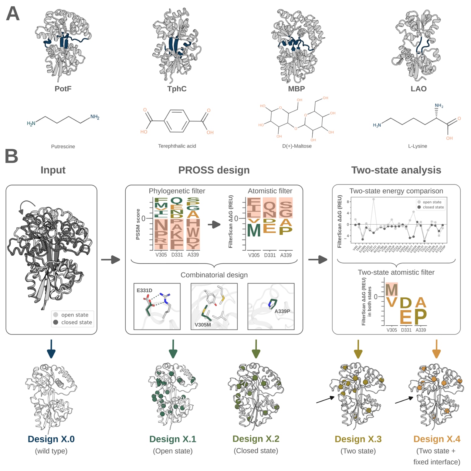 图1|基于单态和双态PROSS设计优化周质结合蛋白稳定性的设计策略。 (A) 选取了四种周质结合蛋白:腐胺结合蛋白PotF、对苯二甲酸结合蛋白TphC、麦芽糖结合蛋白MBP以及赖氨酸结合蛋白LAO。图中以示意图形式展示了闭合态晶体结构(灰色),其中铰链区域以蓝色标出。(B) 设计策略以PotF、TphC、MBP和LAO的开放态与闭合态晶体结构作为输入。所有周质结合蛋白的野生型序列作为对照(设计X.0)。在默认参数下运行PROSS设计计算,分别基于开放态和闭合态结构生成设计X.1和X.2。插图中以PotF的三个PROSS突变为例,展示了新氢键的形成、核心堆积的改善以及环区刚性的增强。突变对能量(ΔΔG)的影响依赖于两种构象状态下的主链构象差异,因此将在任一状态中表现为不稳定(正能量)的突变予以剔除,得到设计X.3。在生成设计X.4时,在运行PROSS设计计算和双态能量筛选之前,对铰链区域和叶片界面进行了固定。设计X.3和设计X.4中的黑色箭头标示了一处由于铰链区域被固定而未出现在设计X.4中的突变。