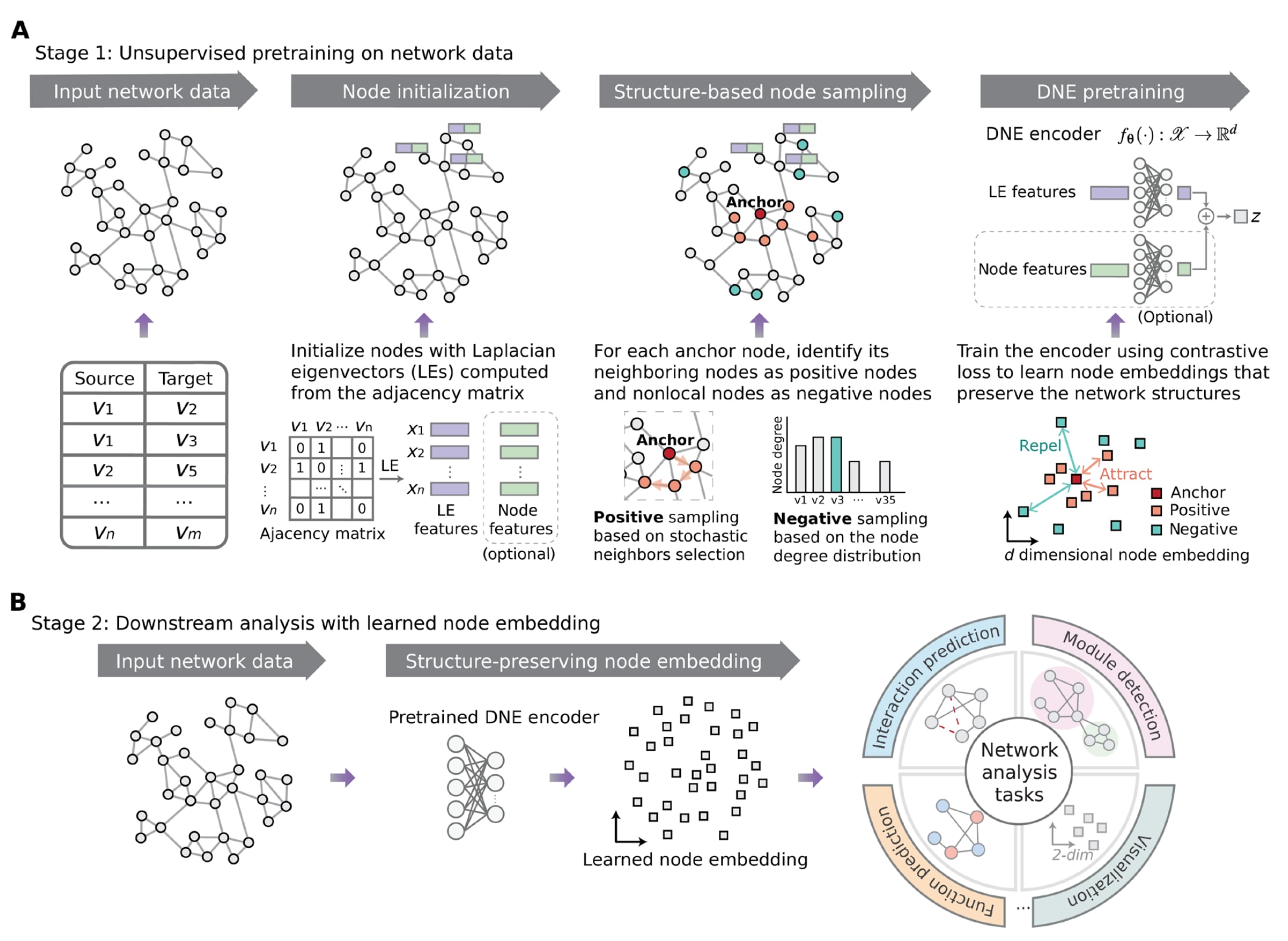 图1|DNE总体框架示意图。 (A)DNE主要包括三个步骤:(i)使用网络邻接矩阵的拉普拉斯特征向量对节点进行初始化,在节点特征可用的情况下,可将其与初始化表示进行拼接;(ii)通过随机化的邻居选择策略将节点的邻居定义为正样本节点,并根据节点度分布从网络其他区域选取负样本节点;(iii)利用深度学习编码器对每个节点进行嵌入表示学习,通过优化编码器参数,使得到的节点表示能够有效区分相邻节点与非局部节点。(B)将训练完成的编码器用于生成节点表示,以支持多种下游分析任务。