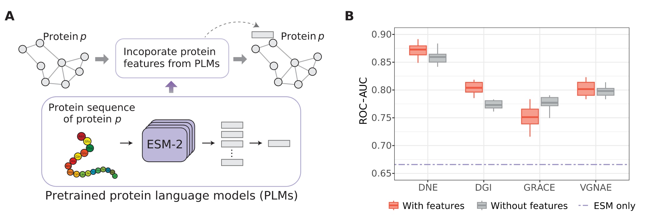 图5|融合蛋白质特征的链接预测性能比较。 (A)将来自蛋白质语言模型的蛋白质特征作为节点特征引入PPI网络,用于网络嵌入学习的示意。(B)在酿酒酵母数据集上,DNE及其他基线方法在10次独立实验中得到的ROC-AUC得分比较。紫色虚线表示仅使用ESM-2提取的蛋白质特征的情形(仅ESM)。灰色箱线表示仅考虑网络结构信息的情况,红色箱线表示同时结合网络结构与节点特征的情况。