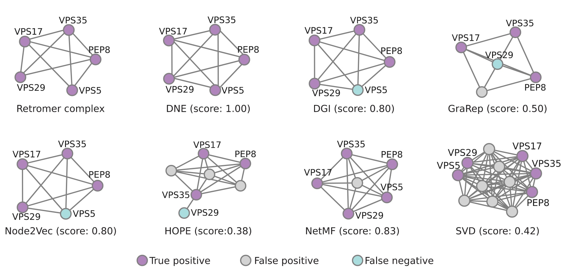 图4|预测复合物与标准Retromer复合物之间重叠程度的评估。 以IntAct注释的Retromer复合物作为基准,用于评估不同方法在功能模块识别任务中的表现。该标准复合物包含五个成员:PEP8、VPS35、VPS29、VPS17和VPS5。预测得到的复合物与标准复合物之间的重叠程度通过Jaccard指数进行衡量。图中紫色表示预测成员属于标准复合物,灰色表示预测成员不属于标准复合物,绿色表示标准复合物中的成员未被预测方法捕获。
