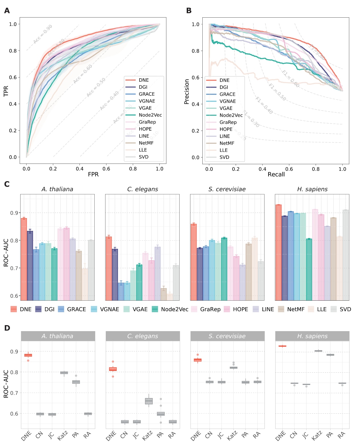 图2|不同方法在四个PPI基准数据集上的链接预测性能。 (A)在拟南芥数据集上,DNE与其他11种网络嵌入方法在PPI预测任务中的ROC曲线,(B)对应的PR曲线。(A)和(B)中的虚线分别表示准确率和F1分数的等值线。(C)DNE与多种网络嵌入方法在四个PPI基准数据集上的性能比较,结果展示了10次独立实验中ROC-AUC的均值及标准差。(D)DNE与基于相似性的链接预测方法在四个PPI基准数据集上的性能比较,展示了10次实验得到的ROC-AUC结果,箱线图中间的横线表示均值,箱体边缘分别表示第一和第三四分位数,须线延伸至四分位距的±1.5倍范围内。
