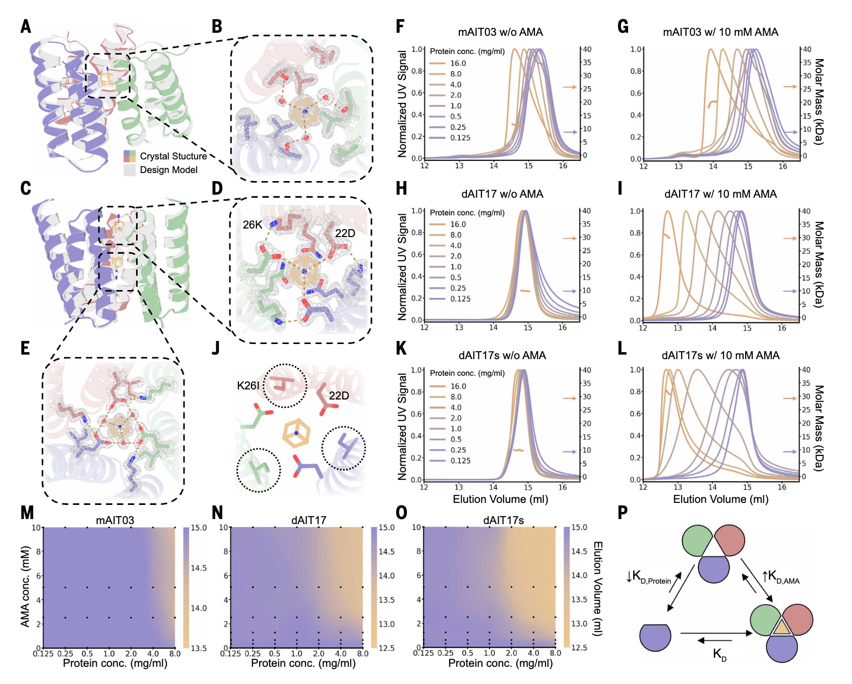 图4|金刚烷胺调控异源二聚体的设计。 (A)金刚烷胺调控异源二聚体的设计流程。首先将同源三聚体结构中的两个蛋白亚基通过一个环-螺旋-环基序连接,构建异源二聚体复合物。为消除小亚基在金刚烷胺存在下的自聚集倾向,在序列设计中引入明确的位点负向设计策略,在优化异源二聚体界面的同时破坏同源三聚体界面。(B)通过体积排阻色谱验证dAID23.4在金刚烷胺存在下形成异源二聚体。分别对等摩尔量的dAID23.4L(1 mg)和dAID23.4S(0.5 mg)单独存在或混合后(总量1.5 mg)的样品,在有或无5 mM金刚烷胺条件下进行分析。UV Abs.表示紫外吸收信号。(C)在不同金刚烷胺浓度条件下,通过等温滴定量热法测定dAID23.4的结合亲和力。将注射器中的dAID23.4L(300 μM)滴定至量热池中的dAID23.4S(25 μM),缓冲液中含有对应浓度的金刚烷胺。ΔH表示焓变。(D)dAID23.4的晶体结构与设计模型高度一致。(E)在dAID23.4基础上引入的突变用于生成AMA10。其中E132K突变通过定向进化获得,而赖氨酸到异亮氨酸的突变此前已被证明能够增强dAIT17对金刚烷胺的响应性。(F)通过生物层干涉技术验证AMA10的金刚烷胺依赖性结合行为。将生物素化的AMA10S固定在链霉亲和素传感器上,并在含不同浓度金刚烷胺的缓冲液中监测其与配体池中500 nM AMA10L的结合过程。(G)通过等温滴定量热法验证AMA10的金刚烷胺依赖性结合。将AMA10L(300 μM)滴定至AMA10S(15 μM)中,缓冲液含有对应浓度的金刚烷胺。(H)通过拆分AMA10L构建金刚烷胺诱导的异源三聚体。(I)任意两两亚基组合在金刚烷胺存在下均无法发生组装。对等摩尔量的各亚基组合样品进行体积排阻色谱分析,样品总量约为0.1 mg,在有或无10 mM金刚烷胺条件下检测。(J)金刚烷胺诱导异源三聚体组装的体积排阻色谱分析结果。将三种亚基按等摩尔比例混合(总量0.15 mg),在有或无10 mM金刚烷胺条件下进行分析。