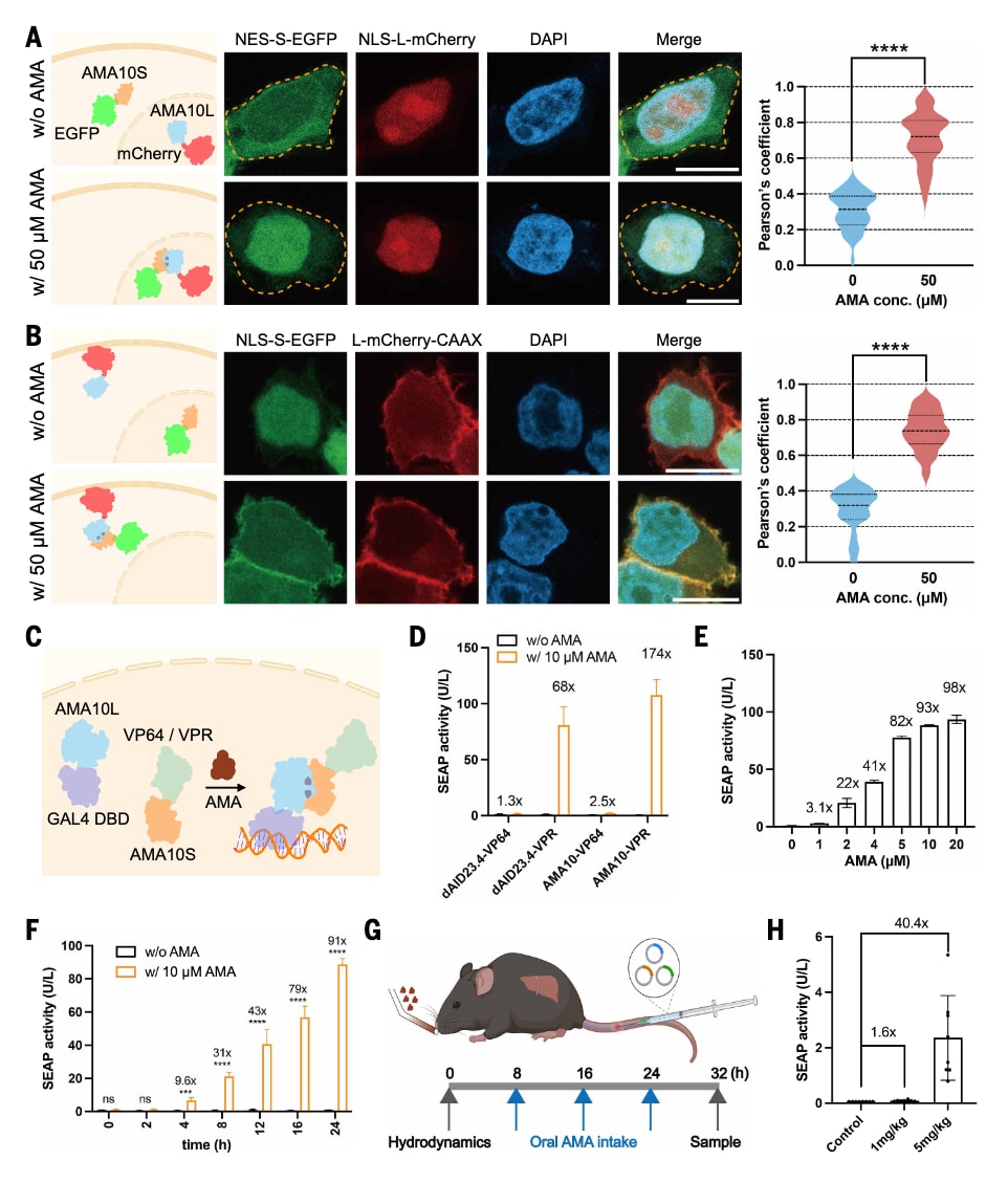 图5|金刚烷胺调控异源二聚体在细胞及体内的应用。 (A)金刚烷胺依赖的核转位可视化。HEK293细胞共转染组成型表达的细胞质定位EGFP标记AMA10S与细胞核定位mCherry标记AMA10L。在转染并于含0或50 μM金刚烷胺的培养基中培养24小时后,进行DAPI染色并采集共聚焦显微图像,比例尺为10 μm。对40个单细胞计算绿色与红色像素强度之间的皮尔逊相关系数。(B)金刚烷胺依赖的质膜转运可视化。HEK293细胞共转染核定位EGFP标记AMA10S与经异戊二烯化修饰、定位于膜的mCherry标记AMA10L。在转染并于含0或50 μM金刚烷胺的培养基中培养24小时后,进行DAPI染色并采集共聚焦图像,比例尺为10 μm。对40个单细胞计算绿色与红色像素强度之间的皮尔逊相关系数。(C和D)金刚烷胺诱导的转录因子重组介导的基因调控。(C)将多种金刚烷胺诱导型异源二聚体体系整合至由Gal4来源DNA结合结构域和人工转录激活结构域组成的合成双组分转录因子框架中,以实现对Gal4特异性启动子的金刚烷胺依赖性激活。实验中,HEK293细胞共转染Gal4依赖型SEAP表达载体以及不同的异源二聚体体系与转录激活结构域组合。(D)在转染并于含0或10 μM金刚烷胺的培养基中培养24小时后,定量检测培养上清中的SEAP水平。数据以*表示$P<0.05$,**表示$P<0.01$,***表示$P<0.001$,****表示$P<0.0001$,ns表示无显著差异。示意图(A)、(B)、(C)和(G)使用BioRender绘制。