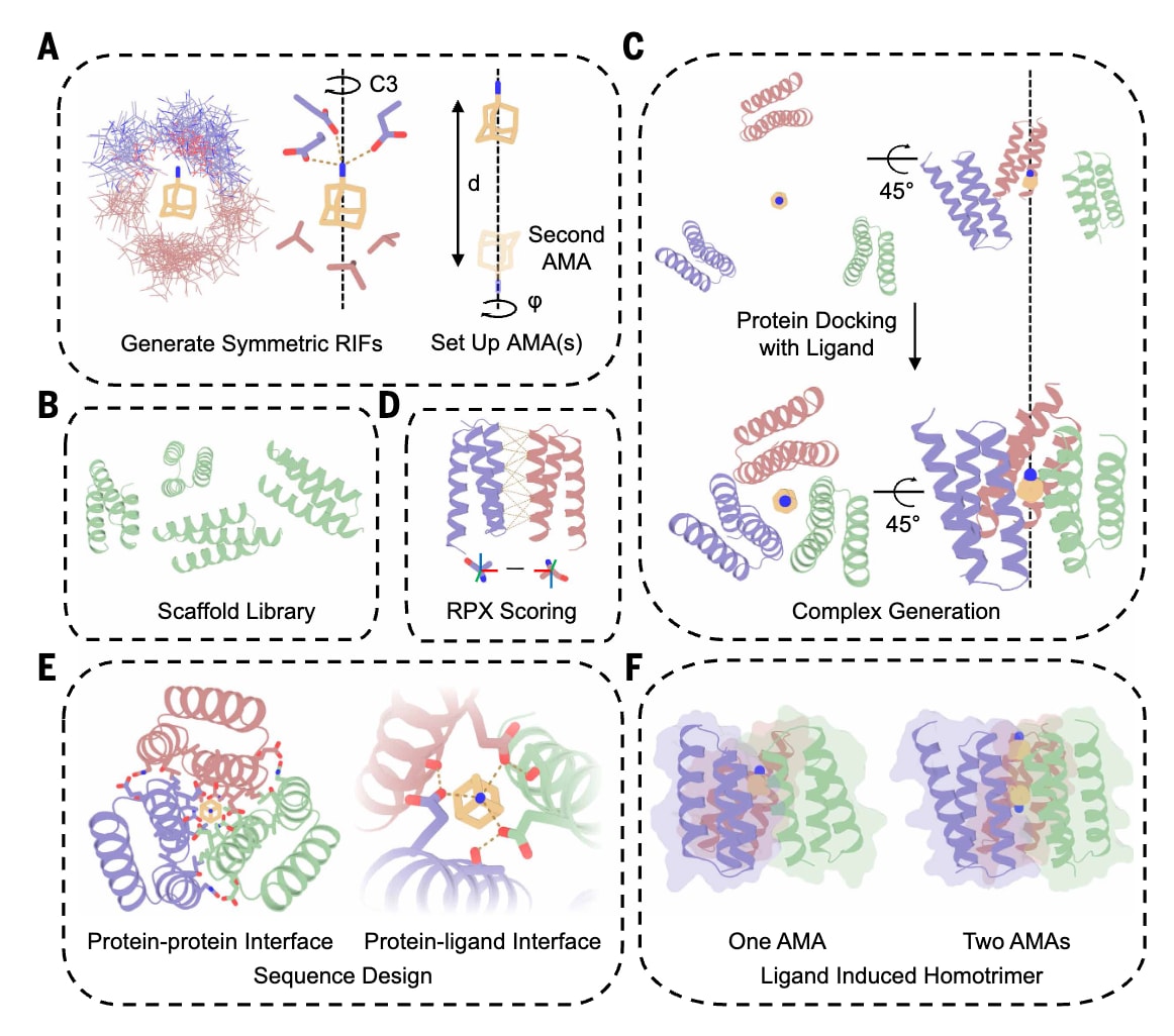 近年来,从头设计小分子结合蛋白在方法学上取得了显著进展,包括基于物理的对接技术以及基于深度学习的生成式方法,最新研究已能够仅依靠计算实现亚埃级结构精度和亚纳摩尔级亲和力。然而,设计能够被小分子调控其组装与解离过程的动态蛋白寡聚体仍然具有较大挑战性。此前的计算设计工作主要通过在天然异源二聚体界面中引入配体结合位点、设计能够识别已有蛋白-配体复合物结合表面的蛋白结合体,或将已设计的小分子结合蛋白拆分为两个组分来实现调控。但这些策略受限于可用的天然蛋白界面或配体-蛋白复合物数量有限,且通常只针对单一蛋白-蛋白界面和单一小分子配体进行设计,从而使其应用范围仍然局限于二聚化。此前曾尝试将具有C3对称性的小分子金刚烷胺对接至预先生成的同源三聚体螺旋束蛋白,以设计可诱导的同源三聚化系统,但未能取得成功。这一失败主要源于金刚烷胺分子尺寸较小,以及在缺乏金刚烷胺时蛋白单体稳定性不足的问题。