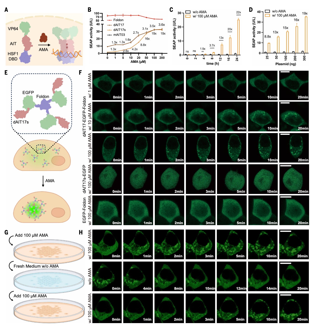 图3|哺乳动物细胞中金刚烷胺诱导的同源三聚体功能验证。 (A)AIT介导的转录调控原理。在含有HSF1特异性热休克元件的最小启动子中,转录激活依赖于由HSF1来源的DNA结合结构域、转录激活结构域VP64以及AIT组成的合成转录因子发生同源三聚化。(B)金刚烷胺诱导同源三聚体介导的转录调控。HEK293细胞共转染HSF1诱导型SEAP表达载体以及编码不同合成HSF1变体的表达载体,这些变体均包含HSF1DNA结合结构域、VP64转录激活结构域以及不同AIT构件,在含不同浓度金刚烷胺的培养基中培养后定量检测培养上清中的SEAP水平,每组包含3个生物学重复。组成型三聚体转录激活因子HSF1DBD-Foldon-VP64作为对金刚烷胺不响应的对照。(C)AIT介导转录调控的动力学特征。HEK293细胞转染SEAP报告载体和编码金刚烷胺依赖型合成转录因子的表达载体,该转录因子由HSF1DNA结合结构域、dAIT17s和VP64组成。在含0或100 μM金刚烷胺的培养基中培养,并在24小时内不同时间点测量培养上清中的SEAP水平,每组包含4个重复。(D)AIT介导转录调控的优化。HEK293细胞转染固定量的SEAP报告载体以及不同剂量的合成转录因子表达载体,在含0或100 μM金刚烷胺的培养基中培养24小时后检测SEAP水平,每组包含3个生物学重复。(E和F)金刚烷胺依赖的生物分子凝聚体。通过将dAIT17s与EGFP标记的foldon融合,构建了遗传编码的金刚烷胺诱导型凝聚结构。仅将EGFP与foldon融合或仅将dAIT17s与EGFP融合的构建体作为阴性对照。HEK293细胞转染相应表达载体后暴露于不同浓度的金刚烷胺,在转染24小时后于20分钟内采集EGFP信号的时间序列图像,比例尺为10 μm,所示为三次独立实验的代表性结果。(G和H)金刚烷胺依赖性凝聚体形成的可逆性。表达金刚烷胺诱导型凝聚体的HEK293细胞交替经历加入100 μM金刚烷胺20分钟和洗脱至不含金刚烷胺培养基20分钟的循环处理,在每个循环过程中于20分钟内采集EGFP信号的时间序列图像,比例尺为10 μm。(B)、(C)和(D)中的数据以