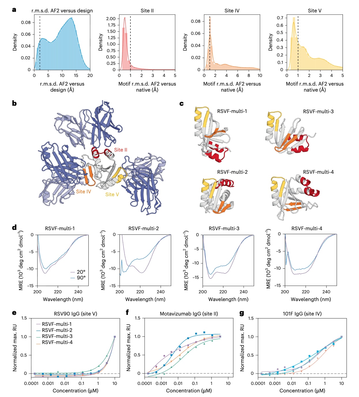 图3|多表位免疫原候选体的实验表征。 a,计算层面的评估,利用AlphaFold2评估预测结构与设计模型之间的一致性,以及预测结构中各表位与天然表位结构之间的相似程度,图中的竖线表示计算筛选中判定为“成功”的阈值。b,RFjoint2生成的代表性设计示例,尽管在设计过程中并未显式约束抗体可及性,但各个表位仍保持对其目标抗体的可结合性。图中将RSVF-multi-4的预测结构分别与三种已知表位特异性抗体进行对齐,分别对应II位点(PDB 3IXT)、IV位点(PDB 3O41)和V位点(PDB 5TPN)。c,筛选得到的多基序支架候选体的预测三维结构。d,展示各支架蛋白在起始温度和终止孵育温度条件下的圆二色谱谱图,用以评估其二级结构稳定性。e–g,采用表面等离子体共振技术测量四种支架蛋白分别与三种表位特异性抗体RSV90(V位点)、motavizumab(II位点)和101F(IV位点)之间的归一化稳态结合亲和力。