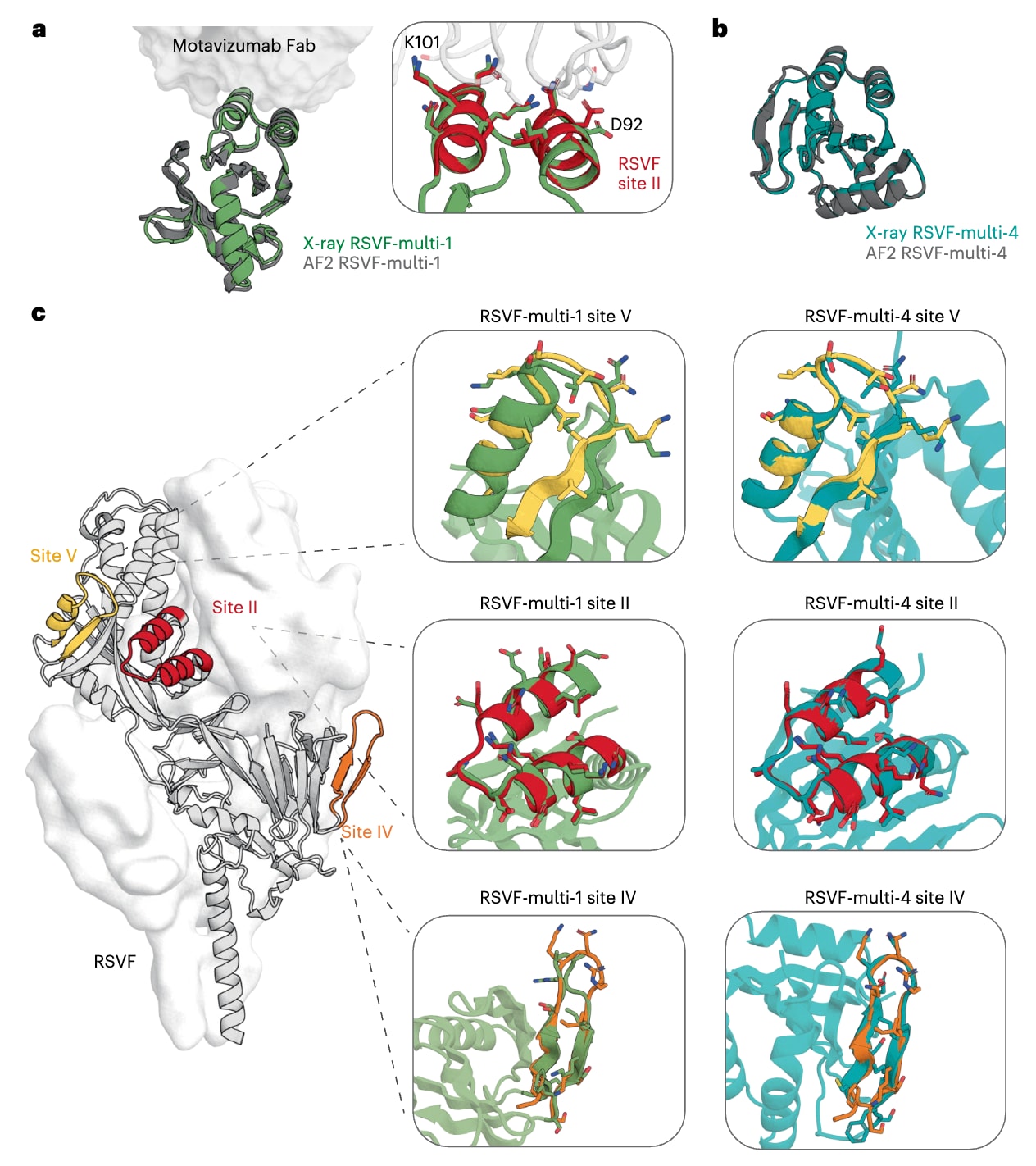 图5|单表位与多表位免疫原的结构表征。 a,RSVF-multi-1与motavizumab结合态的晶体结构(绿色)与AlphaFold2模型(灰色)的叠合结果。插图为局部放大视图,展示RSVF-multi-1中的主要接触残基与motavizumab结合态的天然RSVF II位点结构(红色,PDB 3O45)之间的叠合关系。b,RSVF-multi-4的晶体结构(青绿色)与AlphaFold2模型(灰色)的叠合结果。c,将晶体结构中解析得到的各表位分别与天然RSVF的V位点(黄色)、II位点(红色)和IV位点(橙色)结构进行叠合比较(PDB 5TPN)。