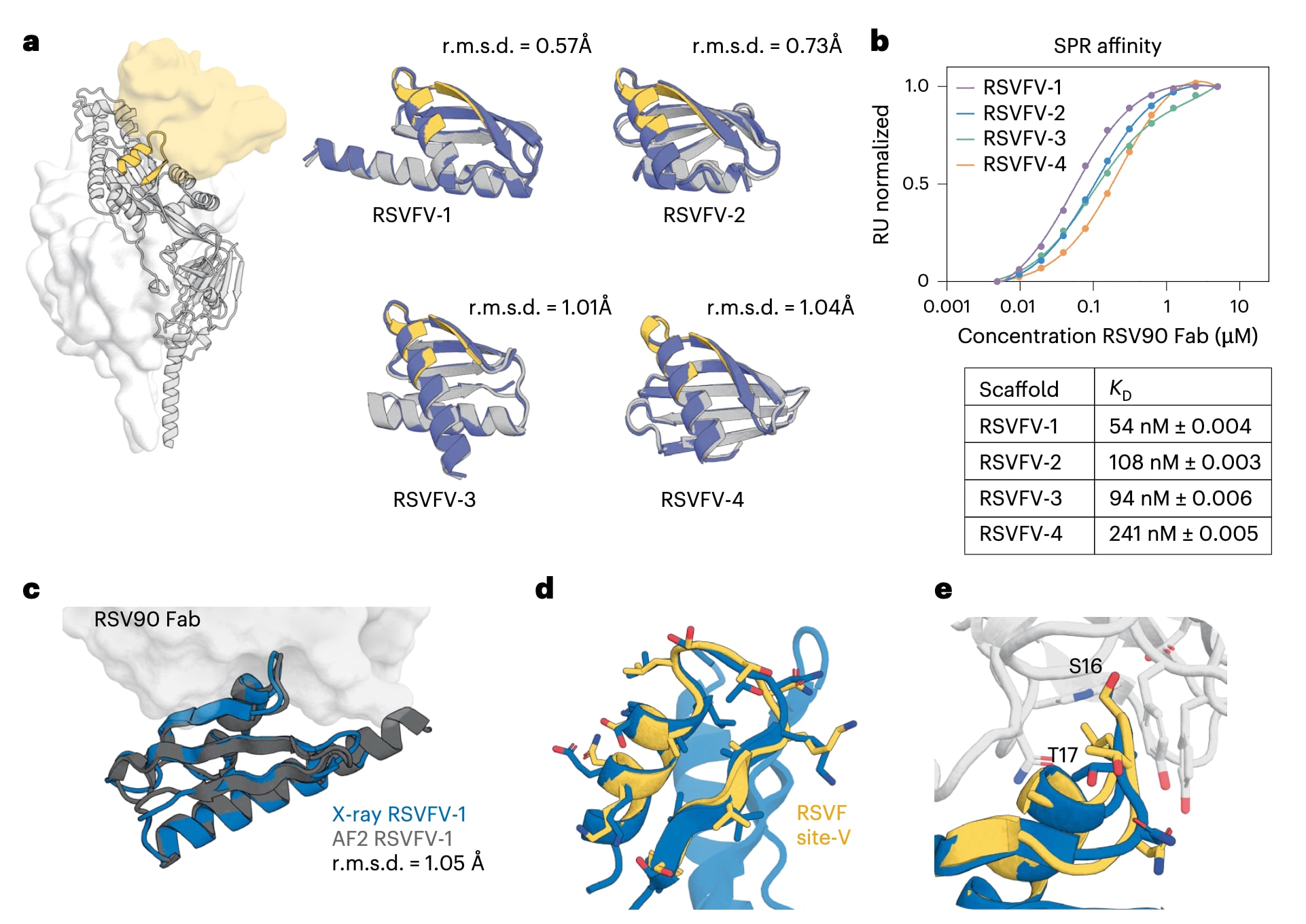 图1|RSVFV免疫原候选体的表征。 a,在RSVF三聚体结构中标示RSVFV表位,并显示其与V位点特异性抗体结合的界面(黄色表面)。左侧为针对RSVF V位点进行支架化的优选候选体,其RoseTTAFold幻觉模型(灰色)与AlphaFold2预测结果(蓝色)叠合展示,并给出了各模型的全原子均方根偏差。b,采用表面等离子体共振技术测量四种设计体与RSV90 Fab之间的稳态结合亲和力,误差为基于曲线拟合计算得到的标准误。c,RSVFV-1与RSV90 Fab形成复合物的晶体结构与AlphaFold2模型高度一致,其主链均方根偏差为