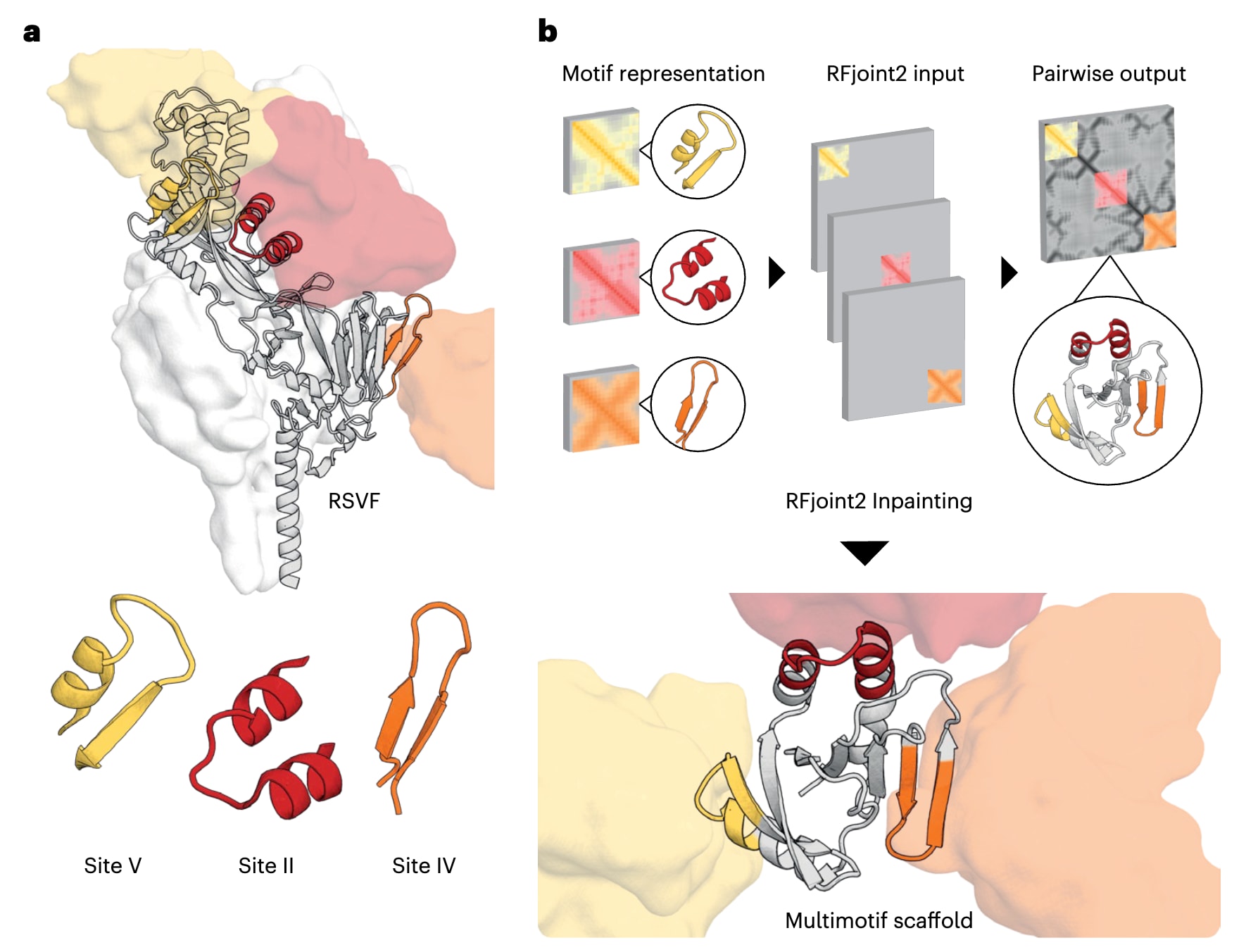 图2|单表位与多表位免疫原的计算支架化设计。 a,在RSVF结构中标示用于单表位和多表位免疫原设计的目标表位,同时展示针对V位点、IV位点和II位点的抗体可变区,其结构分别对应PDB 5TPN、PDB 3O45和PDB 3IXT,不同表位以相应颜色的表面表示。b,多基序支架化设计中,将各个表位基序分别作为模板输入RFjoint2。由于模板输入对整体三维空间位置不敏感,因此在为每个基序提供独立模板时,三种基序之间的相对空间位置并未被预先限定;相反,RFjoint2在设计过程中自动构建一个支架蛋白(灰色),以非天然的相对取向同时支撑这三种基序(彩色)。