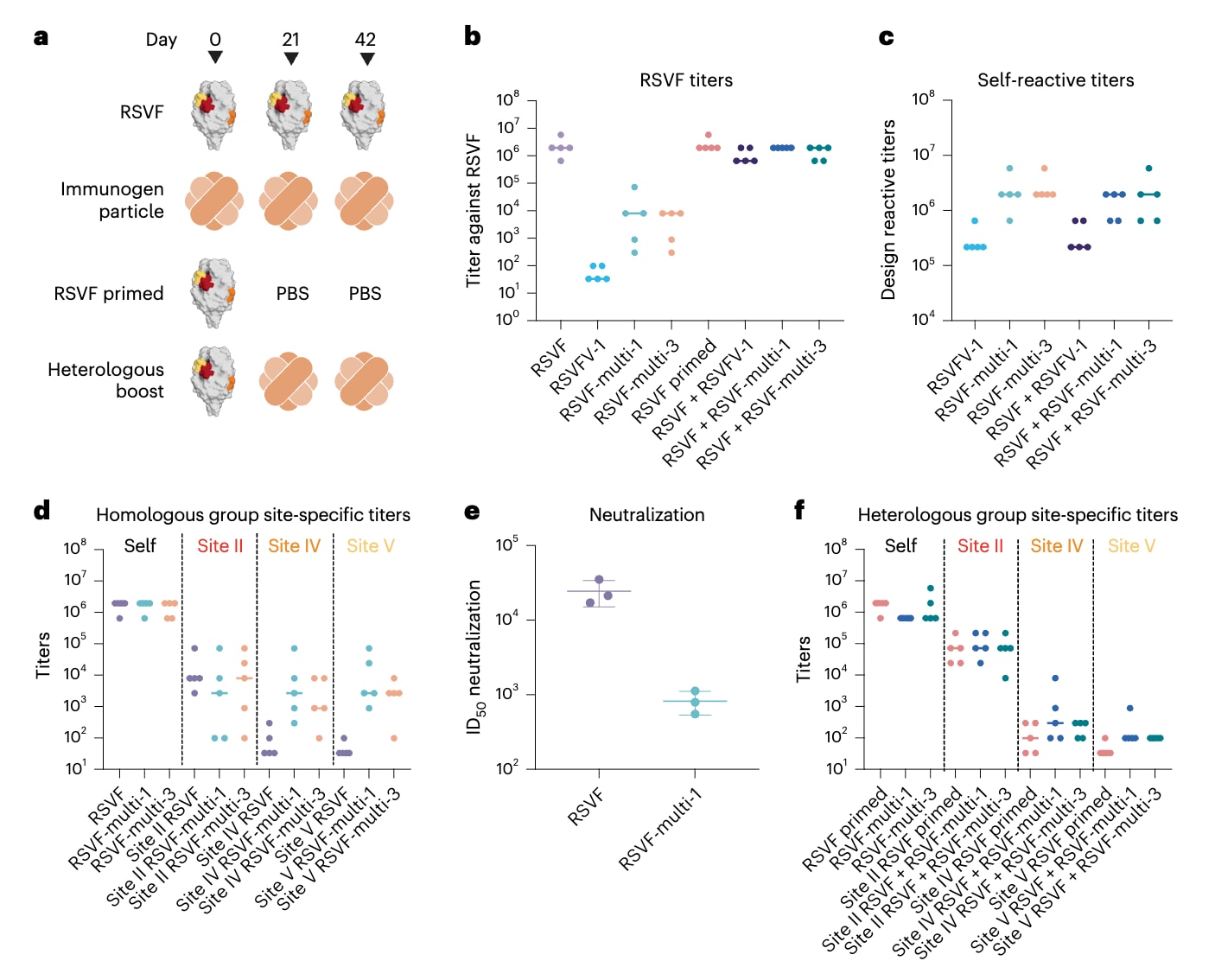为在体内评估免疫反应,该研究对初免小鼠分别使用三种支架进行免疫,包括单表位免疫原RSVFV-1以及两种多表位免疫原RSVF-multi-1和RSVF-multi-3。所有支架均被组装至自组装铁蛋白纳米颗粒上,以增强免疫原性。每组包含5只小鼠,采用同源加强免疫方案,连续注射三次RSVF前融合态三聚体或从头设计的纳米颗粒免疫原 (图4a)。另设异源免疫方案,先以RSVF进行初免,随后以PBS或纳米颗粒免疫原进行两次加强免疫 (图4a)。接受RSVF免疫的小鼠产生的抗体滴度和中和水平与既往研究结果一致 (图4b,f)。与此前关于单表位支架免疫原的研究相符,RSVFV-1主要诱导了针对自身结构的抗体,而对前融合态RSVF的交叉反应滴度较低,且未检测到明显的中和活性,表明诱导的抗体中有较大比例指向从头设计的支架本身 (图4b,c)。相比之下,两种多表位免疫原均诱导了中等水平的前融合态RSVF抗体滴度,较单表位免疫原提高了数个数量级 (图4c)。进一步利用单一免疫原探针检测表位特异性反应时,在两种多表位纳米颗粒免疫中均检测到可量化的位点特异性抗体滴度 (图4d)。尽管II位点的滴度未高于野生型RSVF免疫,但IV位点和V位点的抗体滴度显著提升。尽管针对支架表面或新生表位的抗体在一定程度上限制了整体RSVF抗体滴度,这些结果仍表明,多表位支架能够诱导针对三种被支架化表位的特异性抗体反应。此外,在同源免疫条件下,RSVF-multi-1免疫血清表现出一定的中和活性,尽管仍低于前融合态RSVF,但这一趋势与既往鸡尾酒疫苗研究结果一致 (图4e)。