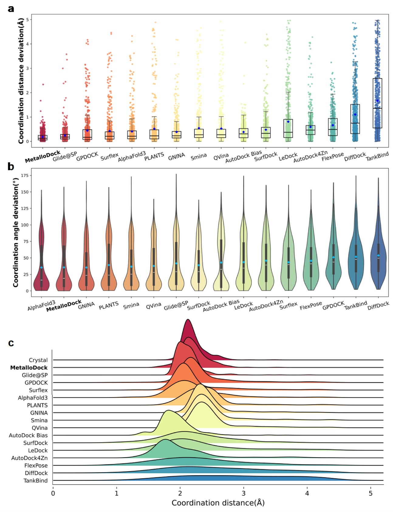 图4|不同分子对接方法在金属配位几何建模中的性能表现。 (a) 各对接模型预测的金属配位距离偏差比较。(b) 各对接模型预测的金属配位角度偏差比较。(c) 不同模型预测的金属-配体配位距离分布与晶体结构中对应分布的岭形图对比。