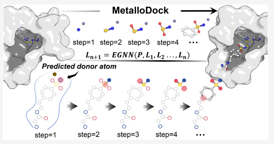 金属蛋白-配体相互作用的准确预测对于金属蛋白靶向药物发现至关重要。然而,传统分子对接工具以及现有的深度学习模型难以可靠地刻画金属-配体相互作用,从而制约了高效金属蛋白抑制剂的发现。针对这一问题,该作则提出了MetalloDock,这是首个专门为金属蛋白靶点设计的深度学习分子对接框架。该方法通过创新性地融合自回归空间解码引擎与物理约束的几何生成范式,能够精确重建金属配位几何结构,并准确捕获金属-配体相互作用,从而同时提升金属蛋白-配体对接精度与结合亲和力预测的可靠性。在自建的基准数据集上的系统评估结果表明,MetalloDock在对接成功率和虚拟筛选性能方面均优于包括AlphaFold3在内的现有方法。在实际应用中,该方法在以前列腺特异性膜抗原为靶点的虚拟筛选中成功鉴定出多种新型命中化合物,并在酸性聚合酶内切酶靶点上实现了理性药物设计,发现了具有较强活性的抑制剂。这些结果表明,MetalloDock在加速金属蛋白靶向药物发现方面具有广泛的适用性,同时也为未来金属蛋白特异性对接算法的评估提供了标准化的研究框架。