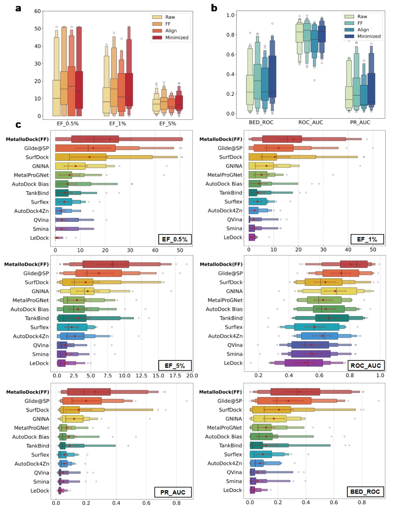 结果表明(图5a, b),不同后处理策略在不同程度上提升了MetalloDock的筛选性能,其整体表现顺序为MetalloDock(FF)、MetalloDock(Minimized)、MetalloDock(Aligned)和未后处理的MetalloDock。其中,在蛋白环境中对配体构象进行全局力场优化的效果反而弱于局部构象优化。该现象可能源于常规力场在能量最小化过程中难以准确描述金属配位相互作用,从而导致金属结合药效团偏离其天然结合位置,最终降低虚拟筛选性能。基于上述结果,研究选择筛选性能最优的MetalloDock(FF)作为代表方法,用于后续与其他对接模型的系统比较。