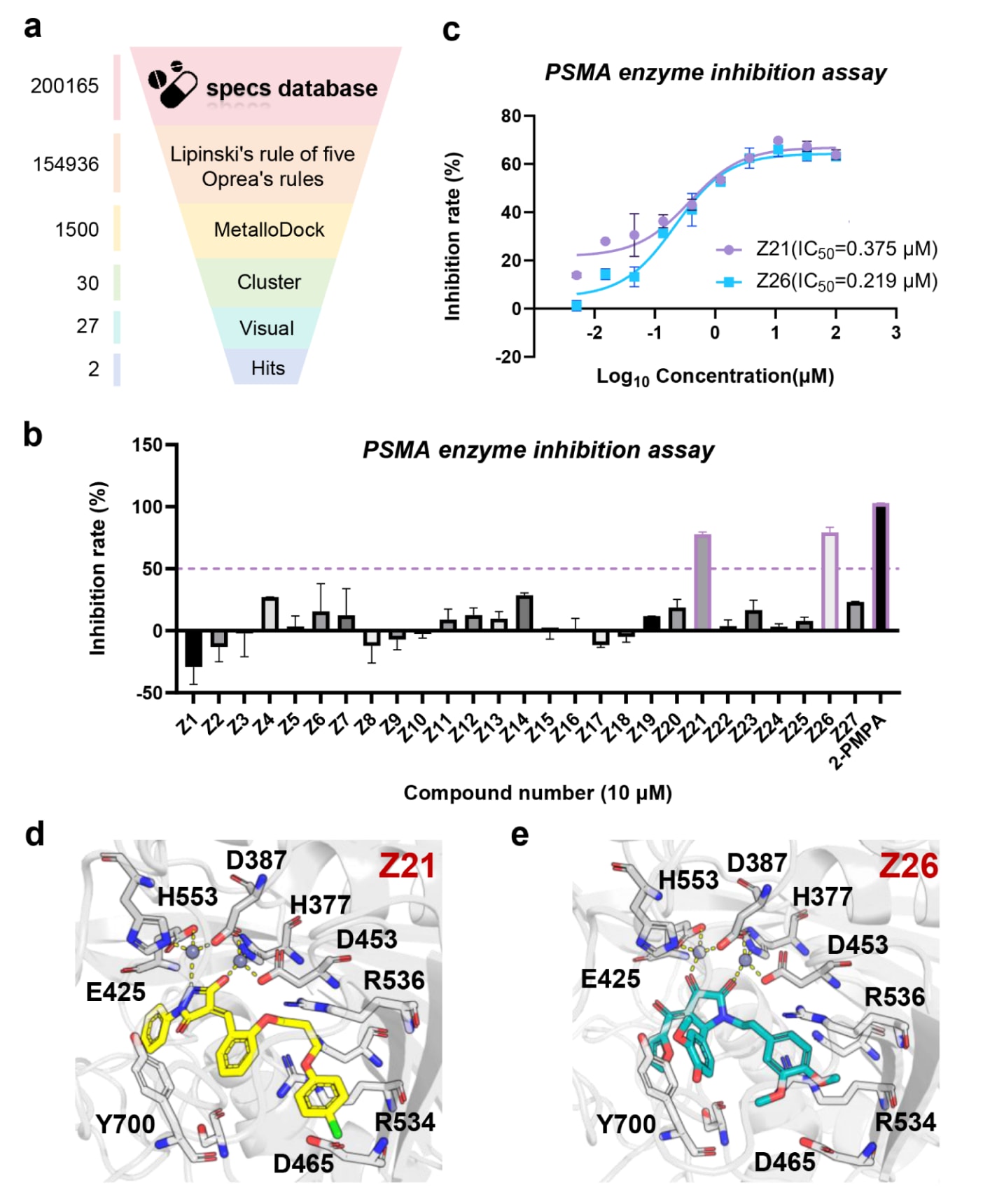 图6|基于MetalloDock鉴定PSMA抑制剂的整体流程。 (a) 以PDB ID:3D7H晶体结构为基础的PSMA靶向虚拟筛选流程示意。(b)通过酶抑制实验评估27个筛选化合物在10μM浓度下对PSMA的抑制活性。(c) 对化合物Z21和Z26在不同浓度条件下的抑制效果进行评估。(d) PSMA与化合物Z21的结合构象及其相互作用模式。(e) PSMA与化合物Z26的结合构象及其相互作用模式。