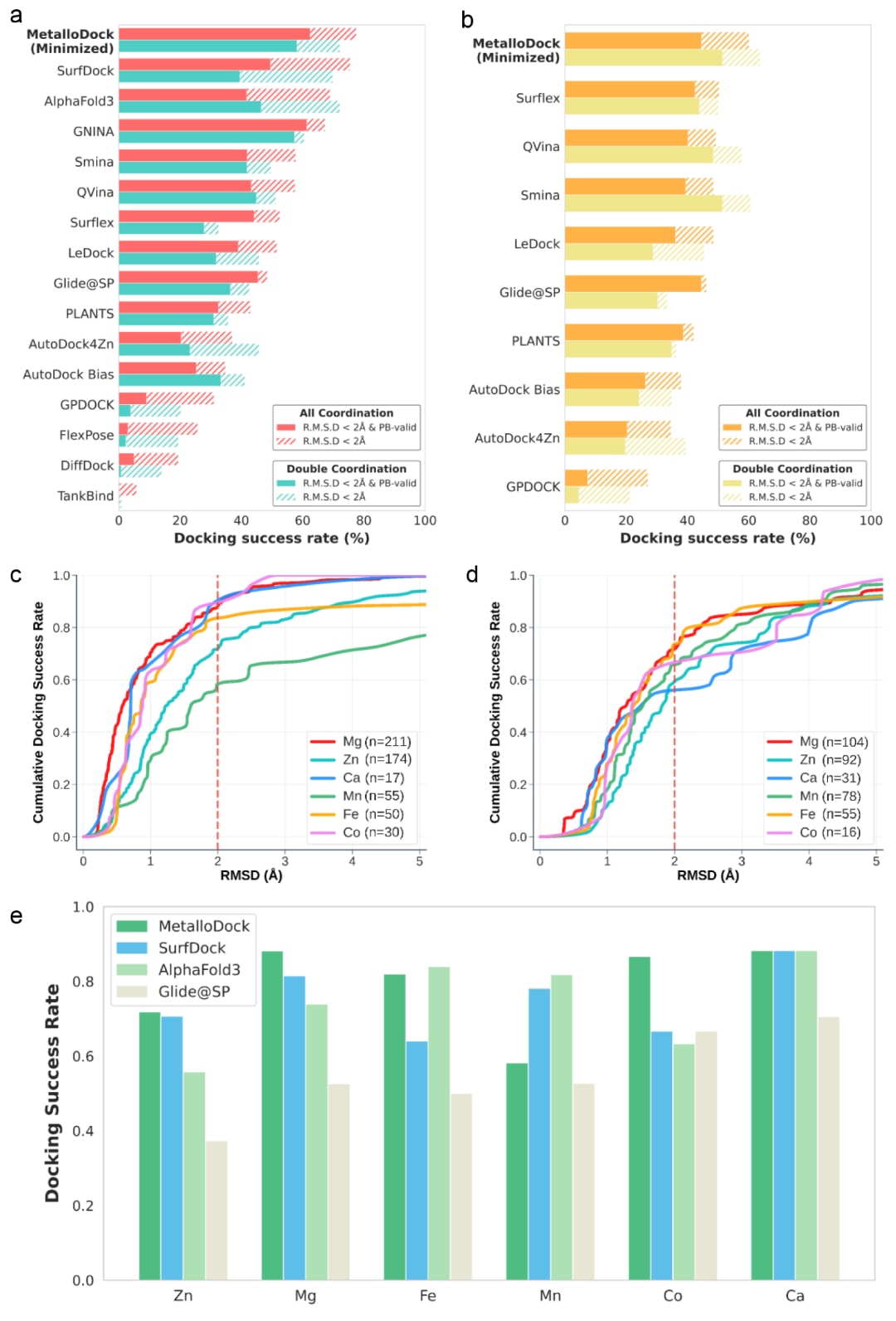 图2|不同分子对接方法的性能比较。 (a) MetalloDock与代表性方法在基于时间分割的金属蛋白-配体复合物子集上的性能表现。(b) MetalloDock与代表性方法在Plinder一致性分割的金属蛋白-配体复合物子集上的性能表现。(c) 在时间分割测试集中,MetalloDock在不同金属类型体系上的累积对接成功率。(d) 在Plinder一致性分割测试集中,MetalloDock在不同金属类型体系上的累积对接成功率。(e) MetalloDock、Glide@SP、AlphaFold3和SurfDock在不同金属类型体系上的对接成功率对比。