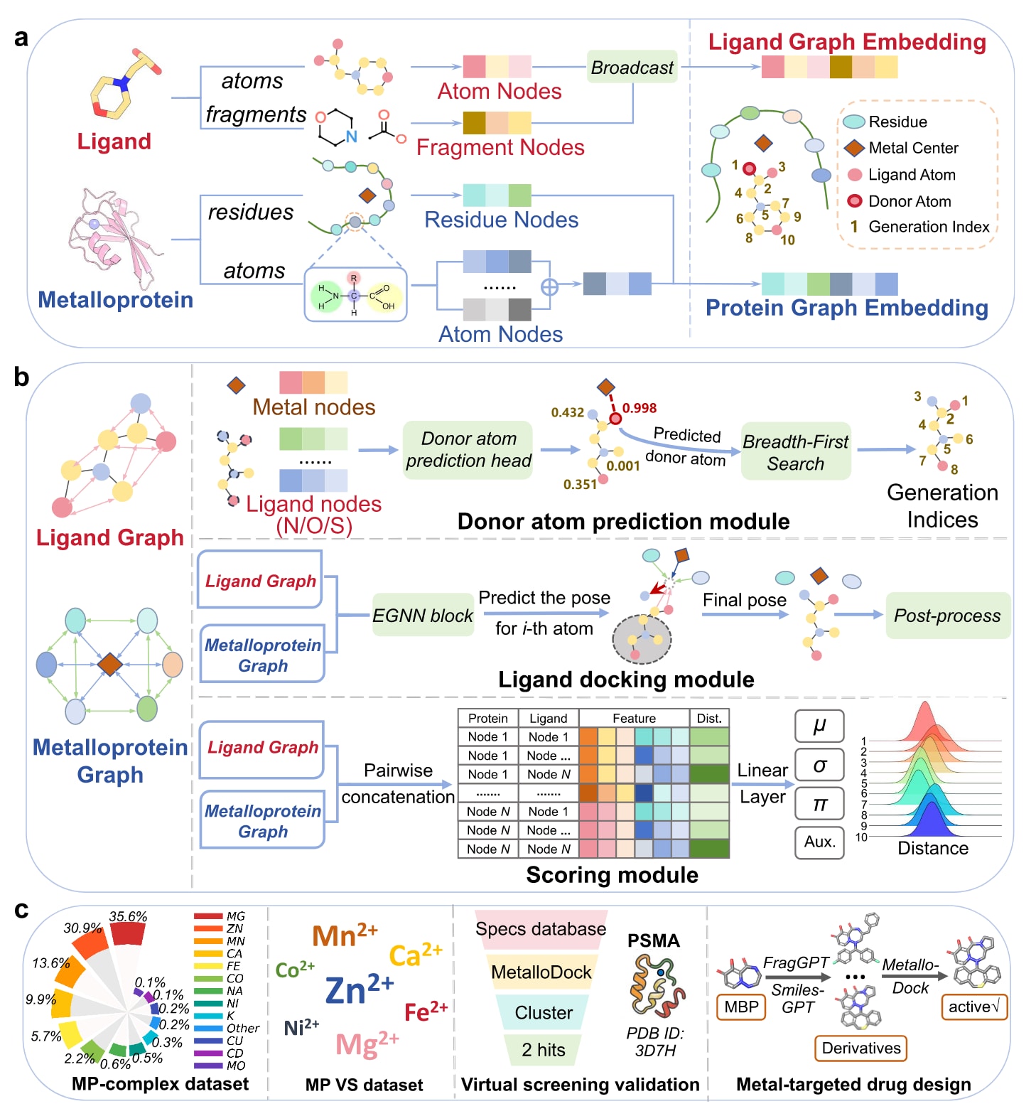 图1|MetalloDock体系结构概览。 (a) MetalloDock中层次化多尺度表示架构的示意图。(b) MetalloDock整体框架示意。模型以金属蛋白和配体作为输入,首先通过供体原子预测模块识别与金属中心发生配位的配体原子,并利用广度优先搜索算法确定配体原子的生成顺序。随后,对接模块基于父原子预测下一个原子的空间坐标,待预测原子在父原子周围随机初始化,其坐标通过E(3)等变图神经网络模块不断更新。生成的结合构象可进一步通过后处理方法进行优化。最后,结合亲和力由混合密度网络打分模块进行预测。(c) 该研究构建的金属蛋白-配体复合物数据集与金属蛋白靶向虚拟筛选数据集的示意图,以及针对前列腺特异性膜抗原的虚拟筛选流程和针对酸性聚合酶内切酶的理性药物设计流程。