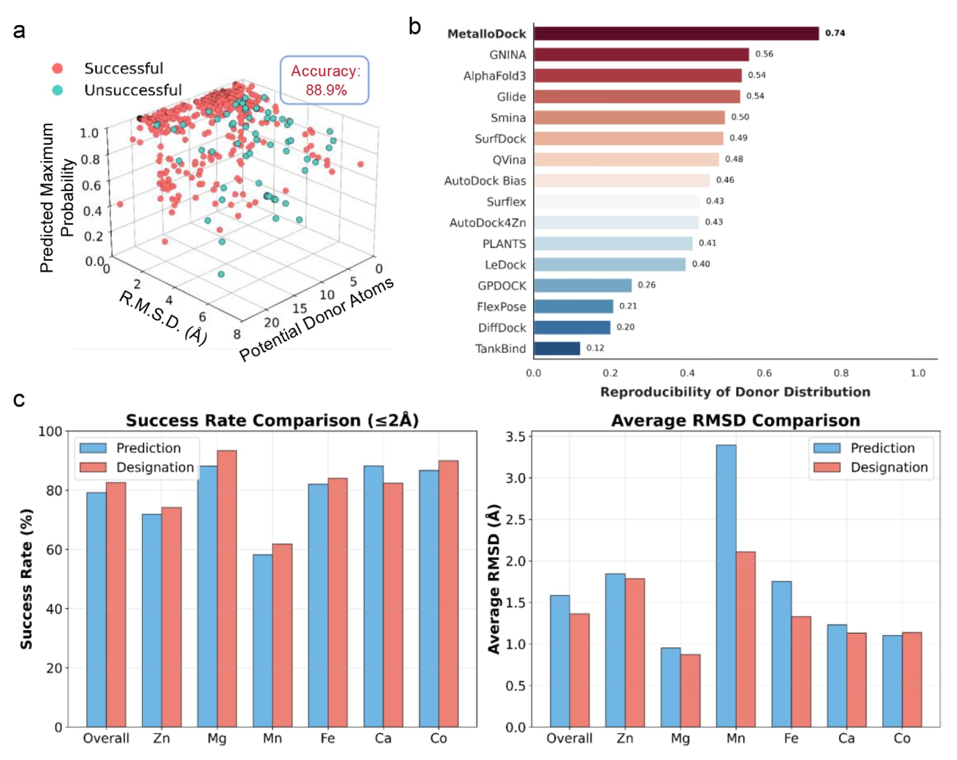 图3|MetalloDock对金属蛋白配体供体原子的预测结果。 (a) 三维散点图展示了数据点在三个变量维度上的分布关系,分别为配体中潜在配位原子的数量(x轴)、对接成功率(y轴)以及模型对所预测配位原子的置信度(z轴)。红色数据点表示模型预测的主要配位原子与真实标注一致的情况,蓝色数据点表示预测不一致的情况。(b) 不同对接模型在金属配位环境中对供体原子分布的再现能力比较,供体原子的预测结果基于CMM在线平台获得。(c) 基于对接成功率和平均RMSD,对比采用MetalloDock自动预测的供体原子与采用用户指定供体原子时的对接结果差异。