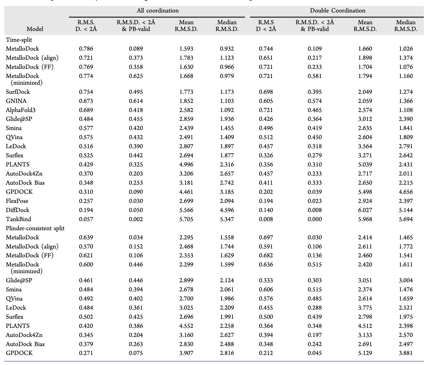 表2|金属蛋白数据集上不同分子对接方法性能的对比分析