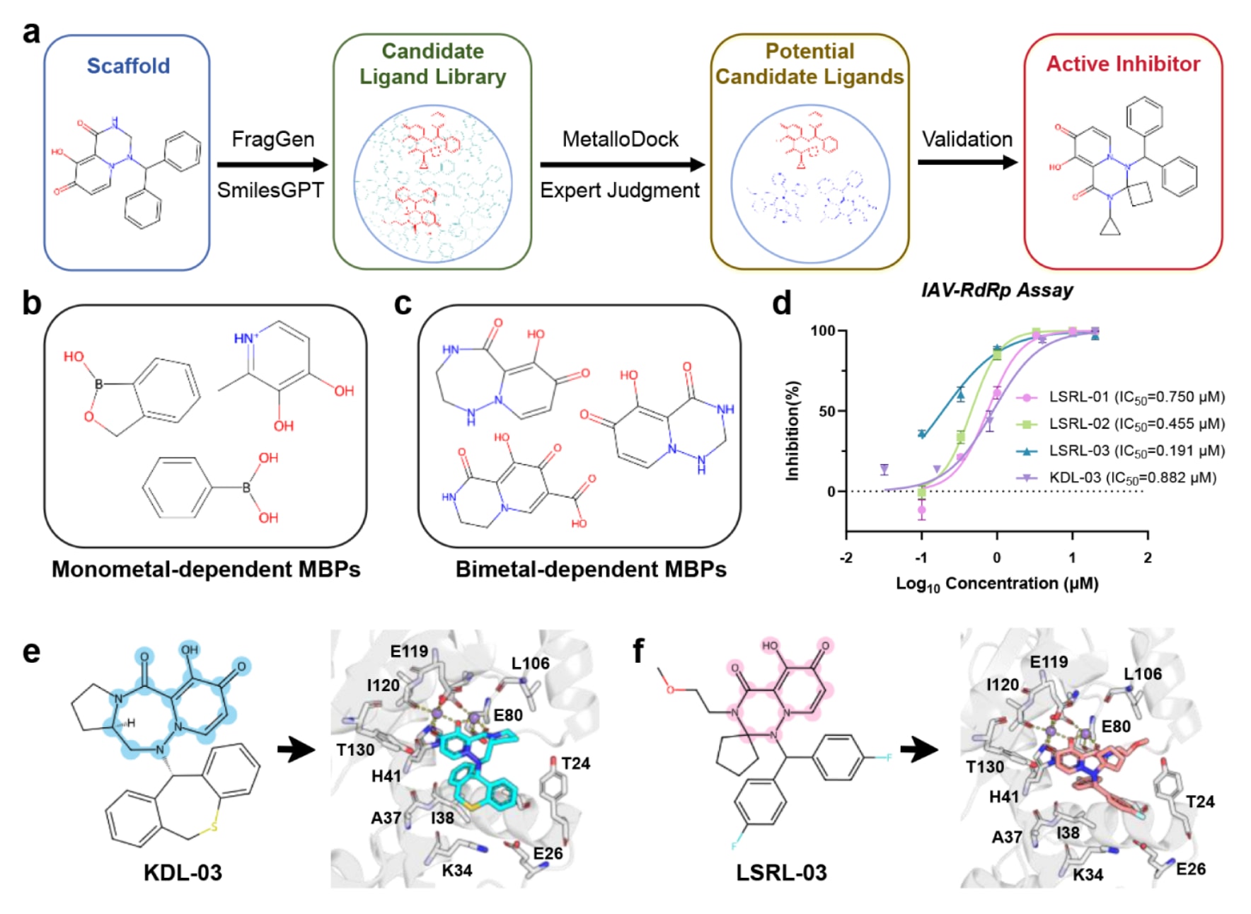 图7|基于MetalloDock的酸性聚合酶内切酶理性药物设计流程。 (a) 针对酸性聚合酶内切酶的理性药物设计整体流程示意。(b) 工作流程中采用的单金属依赖型金属结合药效团的结构。(c) 工作流程中采用的双金属依赖型金属结合药效团的结构。(d) 在不同浓度条件下对LSRL-01、LSRL-02、LSRL-03和KDL-03抑制活性的评估结果。(e) 酸性聚合酶内切酶与化合物KDL-03的结合构象及其相互作用模式。(f) 酸性聚合酶内切酶与化合物LSRL-03的结合构象及其相互作用模式。